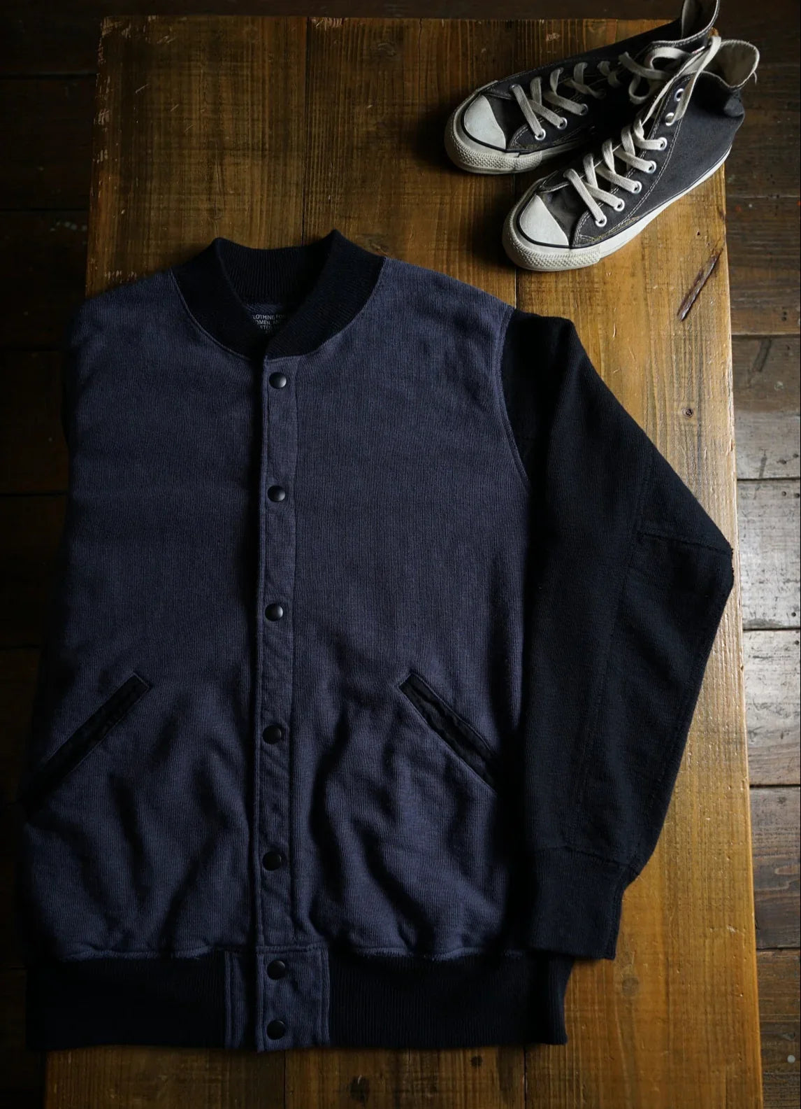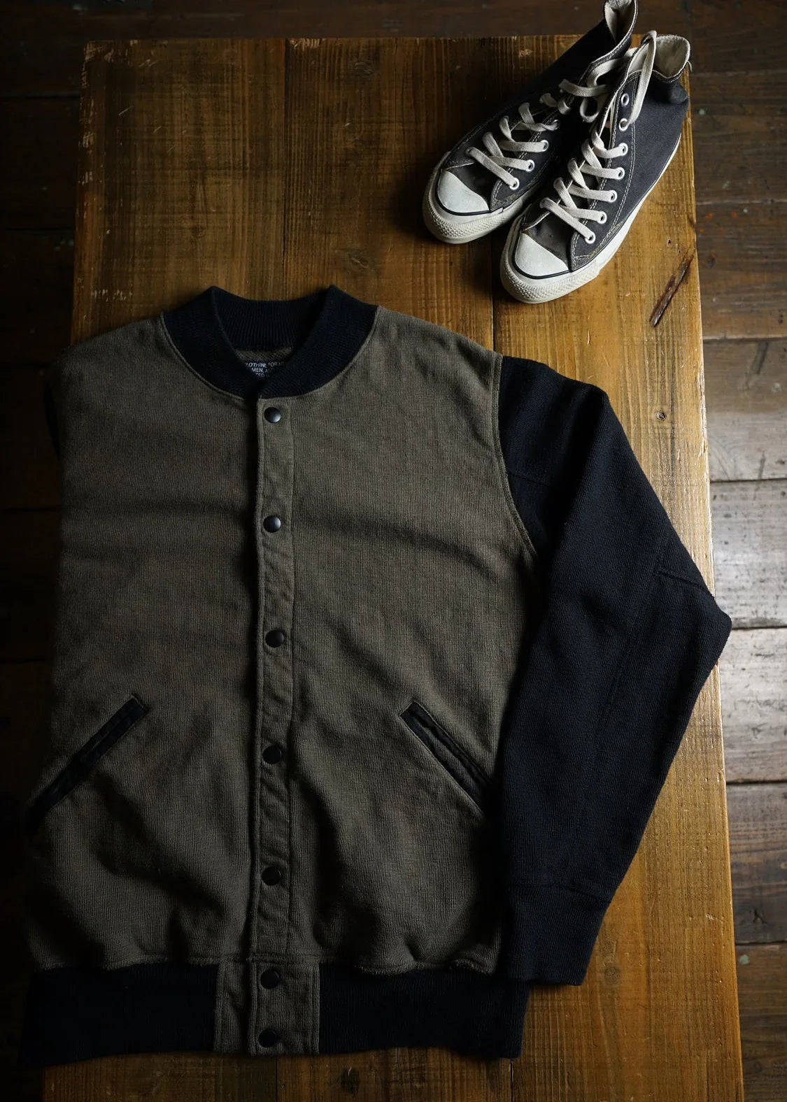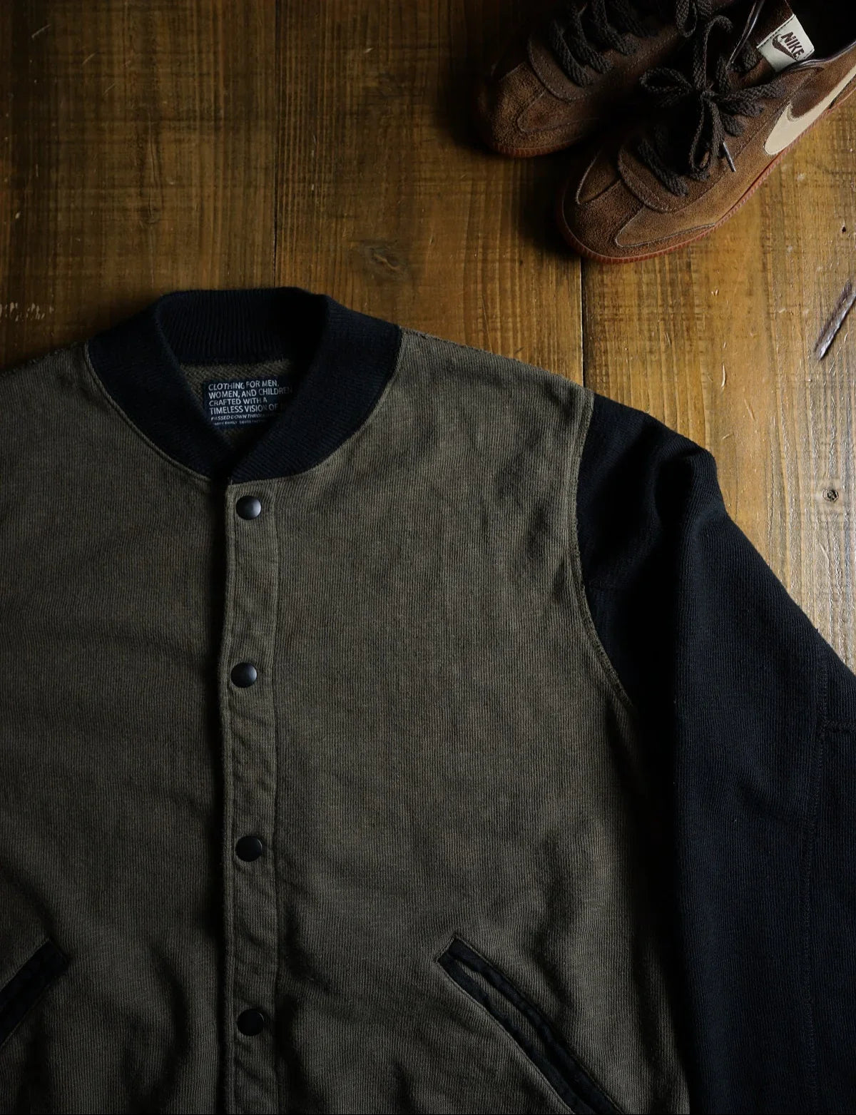 首元、ウエスト、両袖はBLACKを入れながら、前身はマットなスナップボタン仕様で落ち着いたスタジャンになるように。