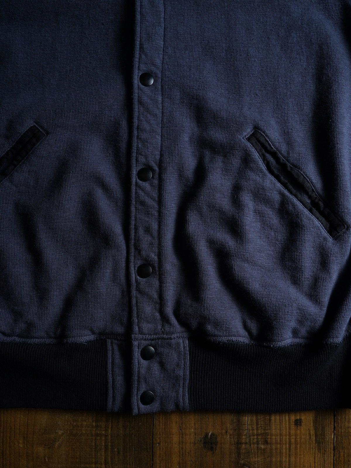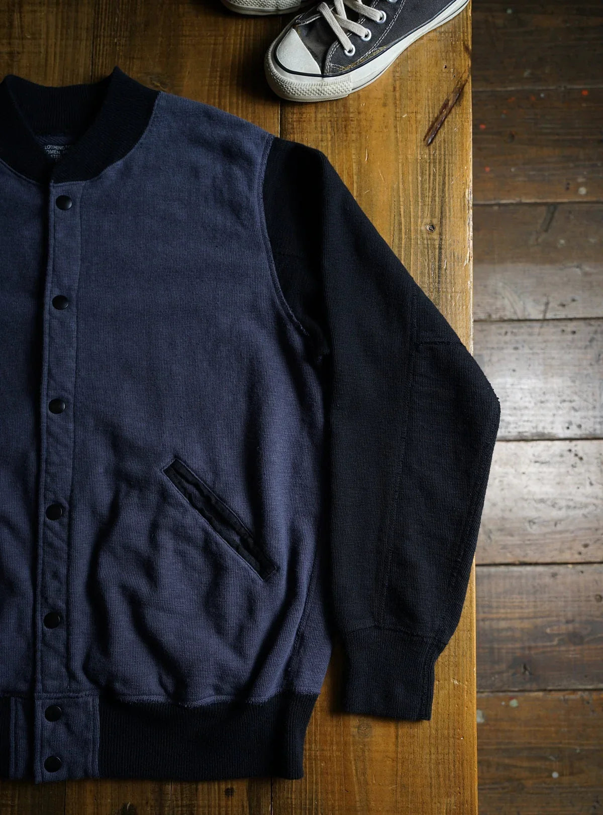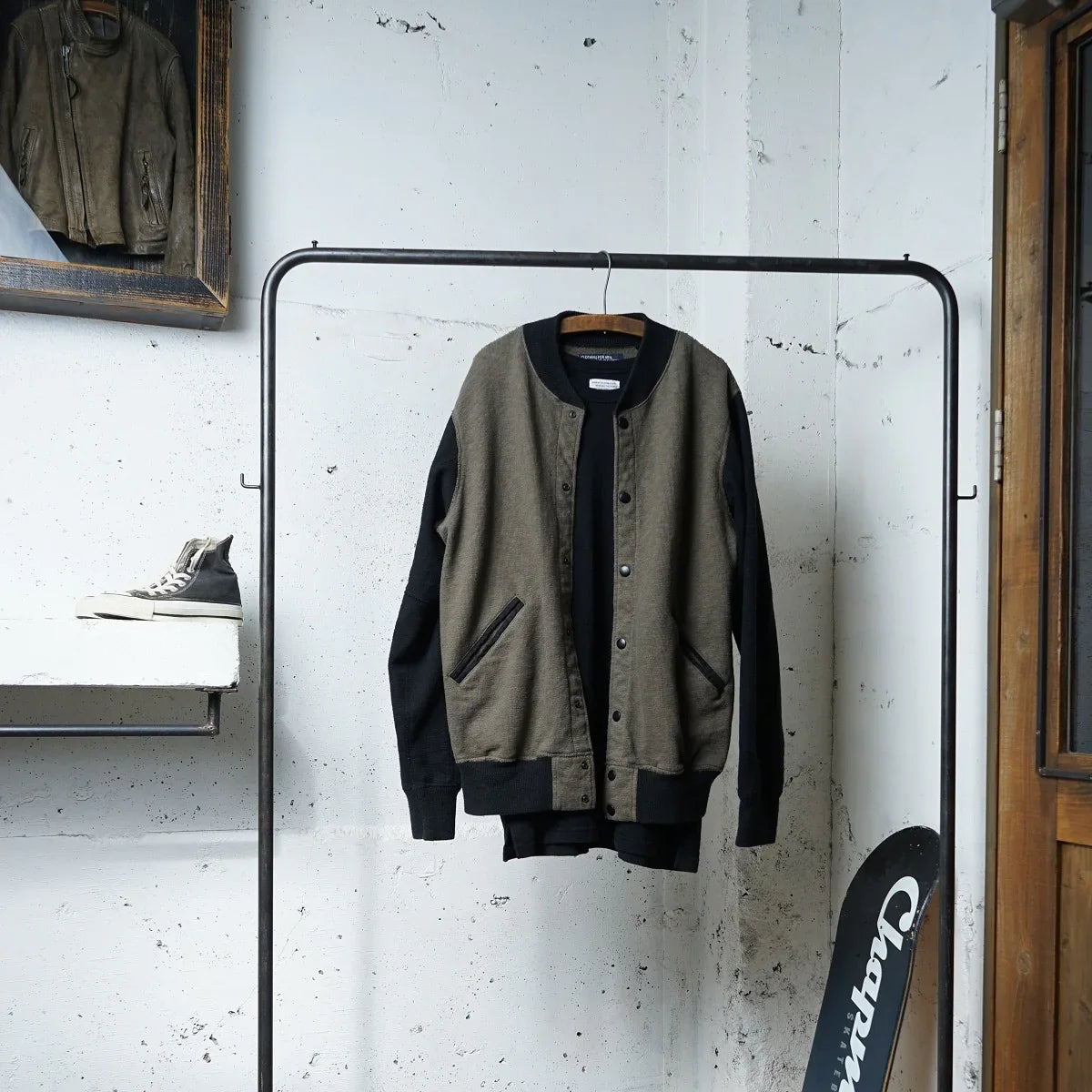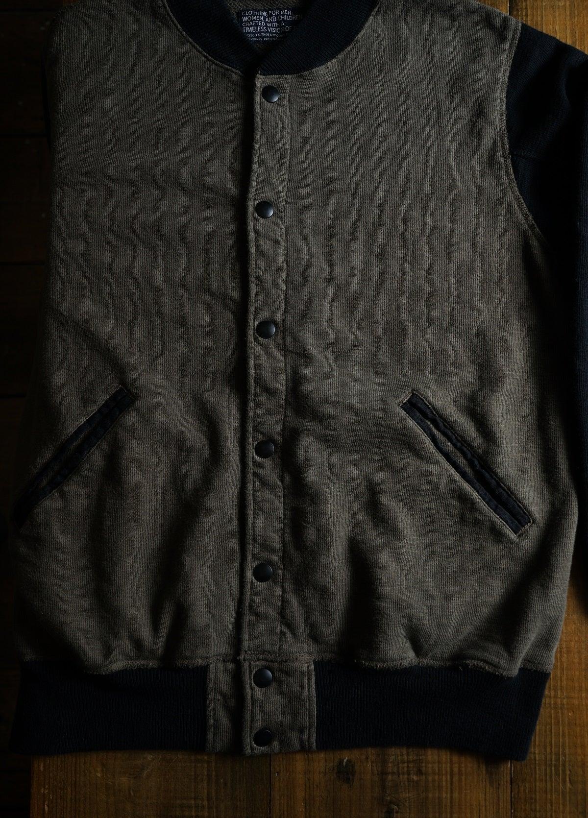 首元、ウエスト、両袖はBLACKを入れながら、前身はマットなスナップボタン仕様で落ち着いたスタジャンになるように。