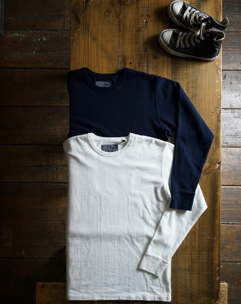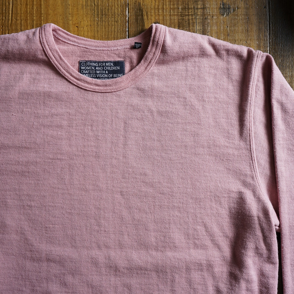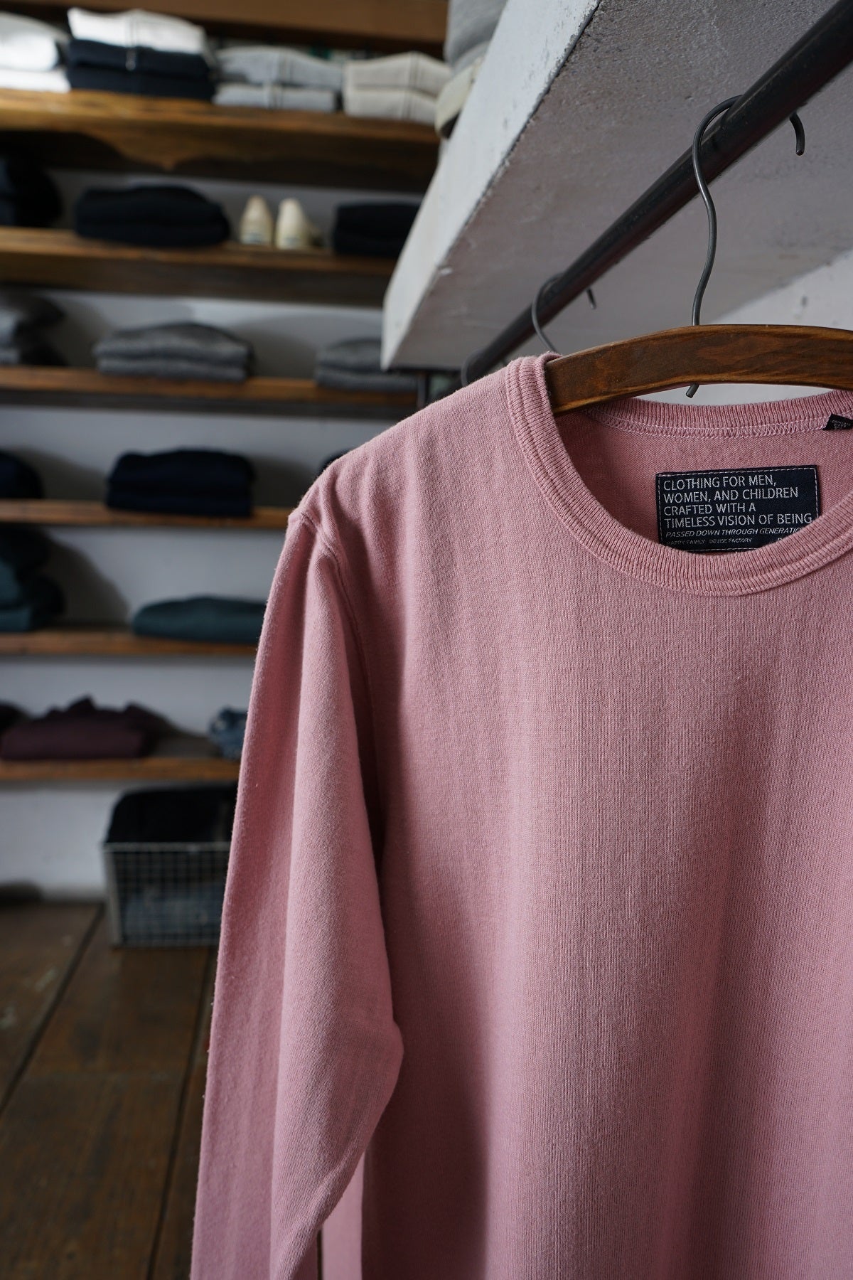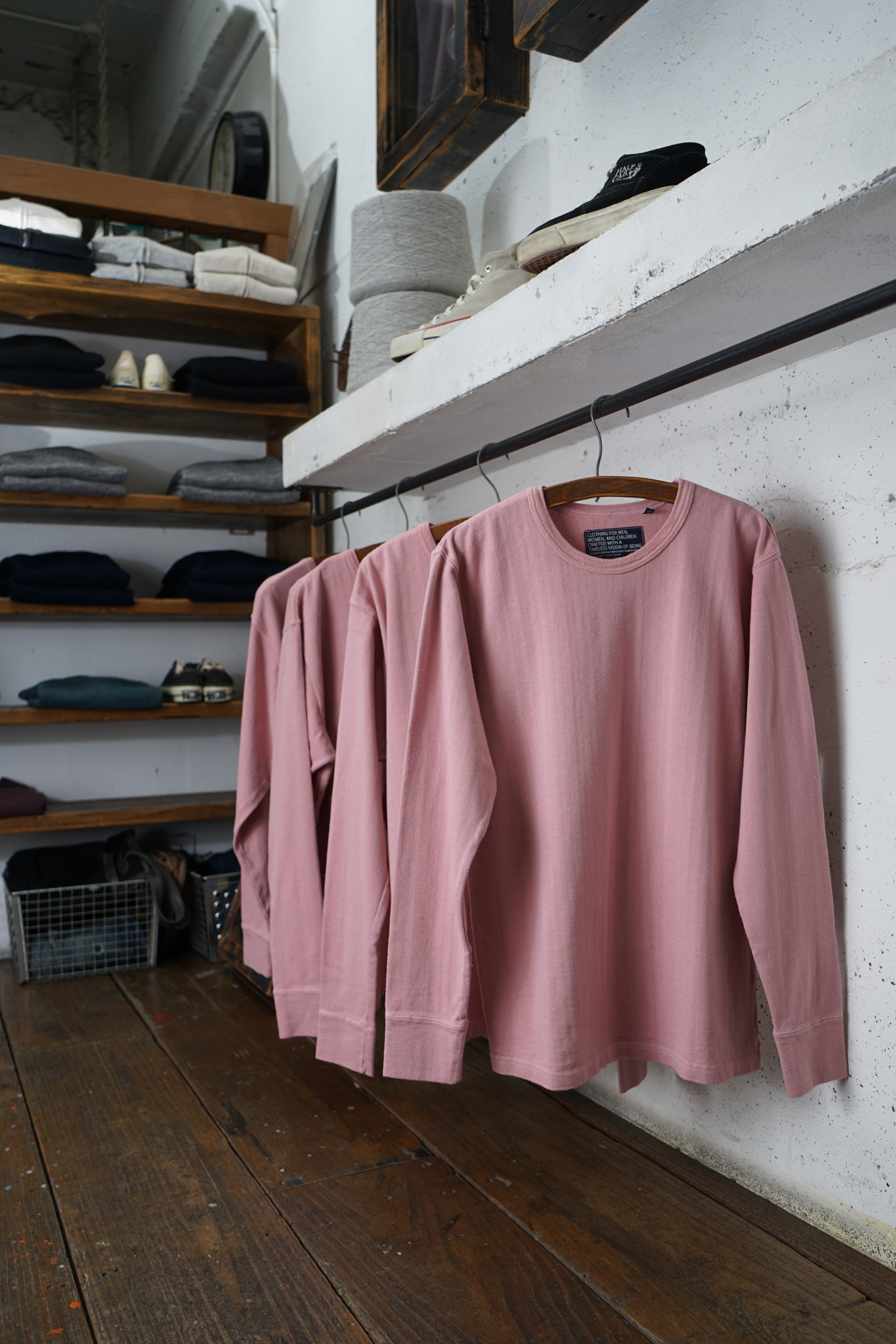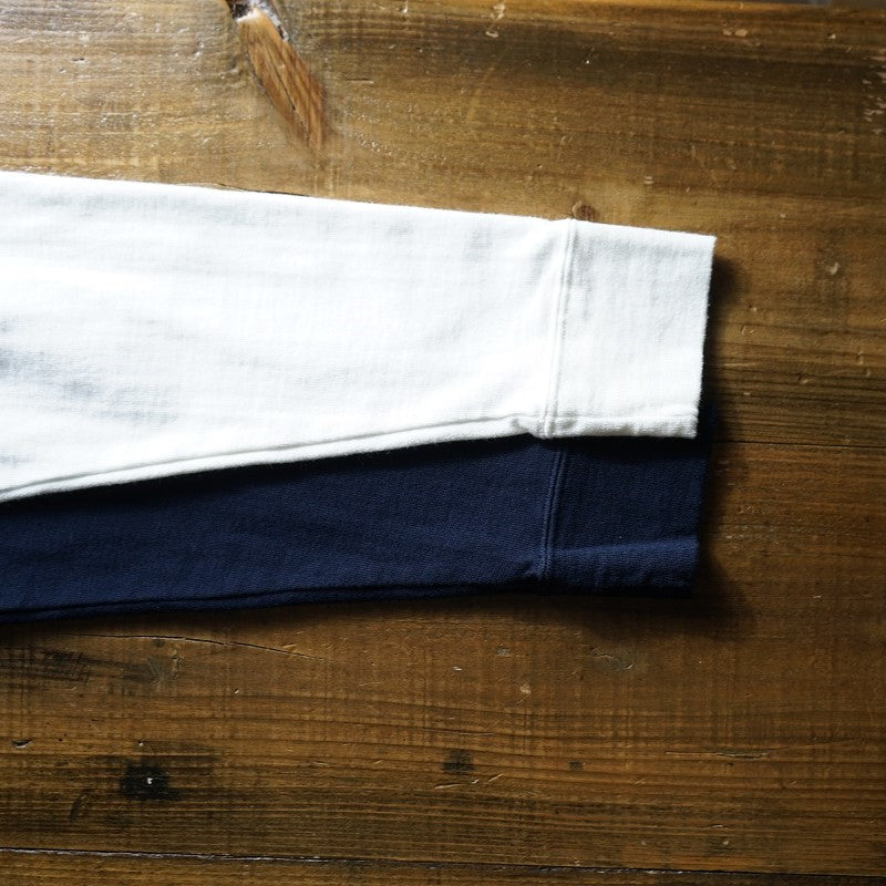 旧式吊り編み機で編み上げた、コットン×レーヨンのブレンド糸による厚めの天竺生地を使用。DF独自のレシピでゆっくりと編み上げることで、柔らかさと耐久性があり、着るほどに肌に馴染む極上の着心地に。