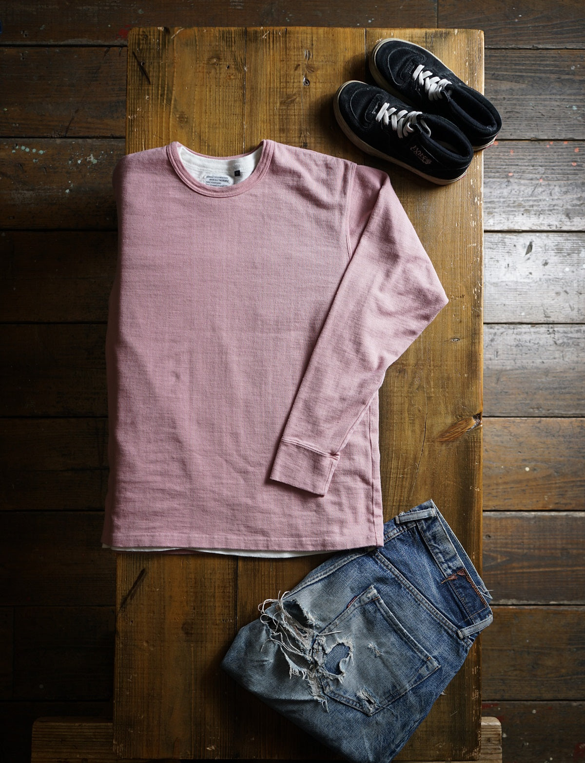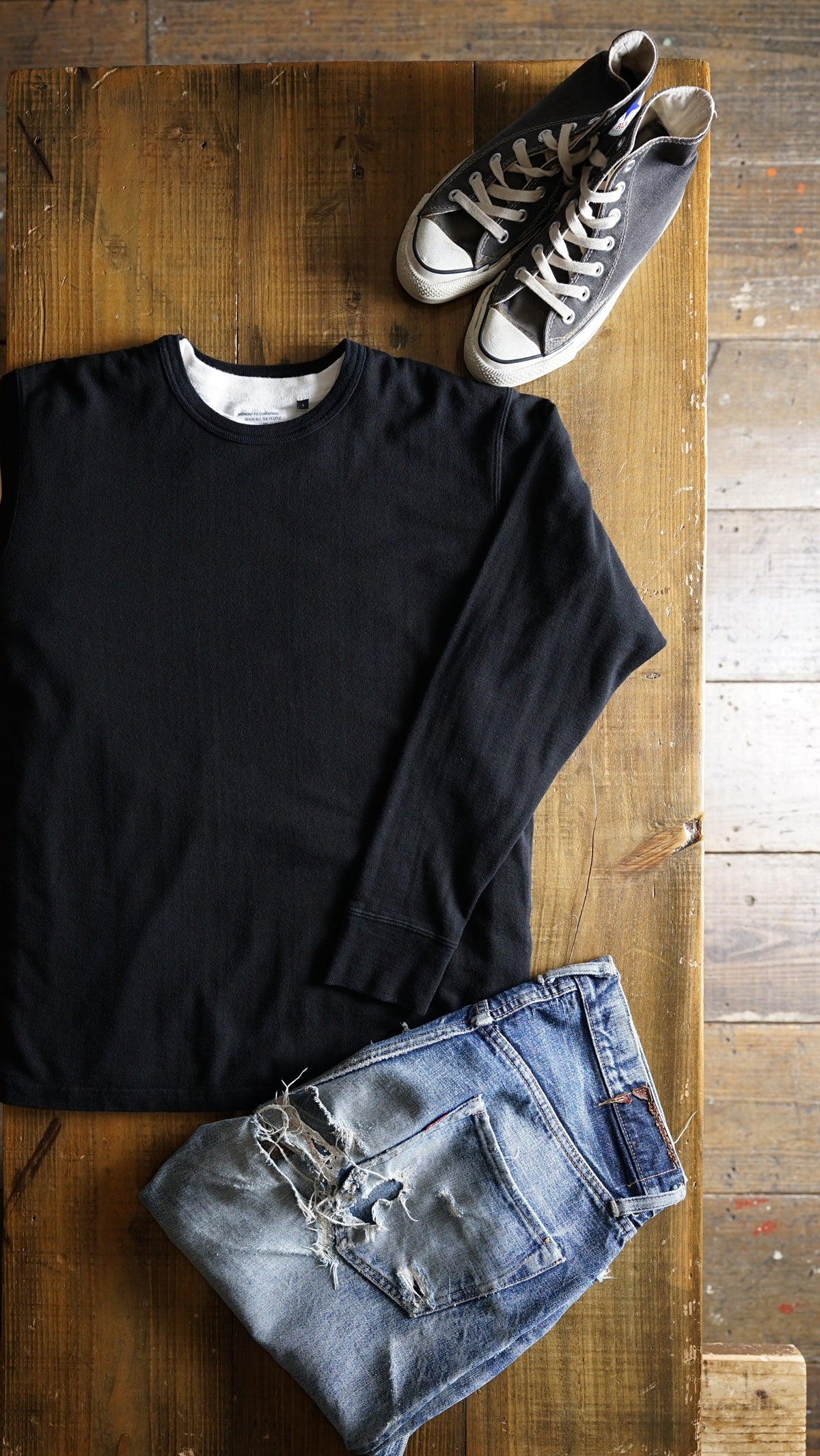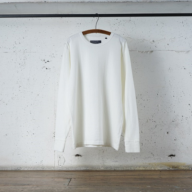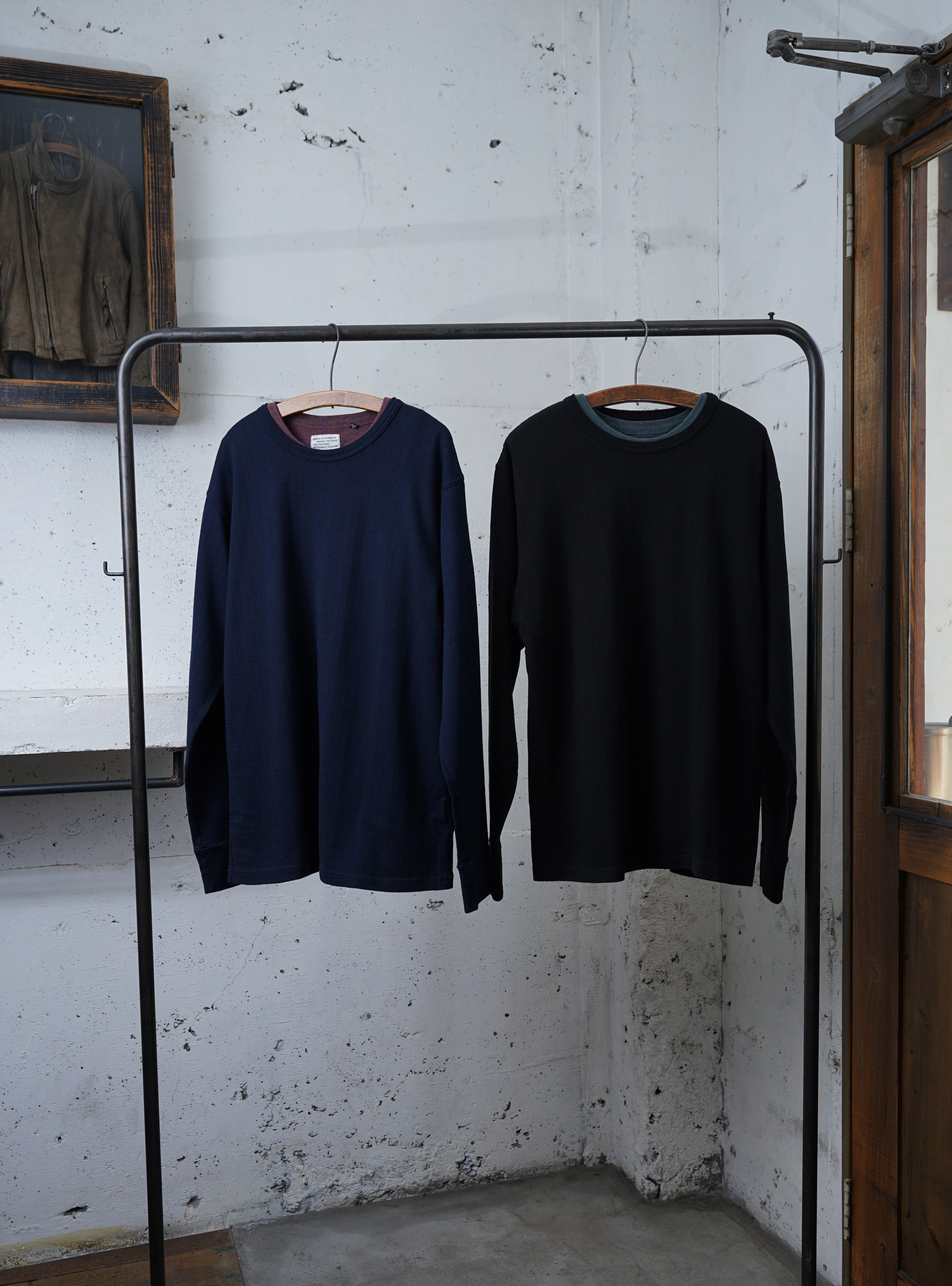 旧式吊り編み機で編み上げた、コットン×レーヨンのブレンド糸による厚めの天竺生地を使用。DF独自のレシピでゆっくりと編み上げることで、柔らかさと耐久性があり、着るほどに肌に馴染む極上の着心地に。