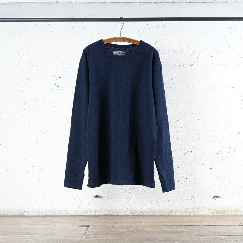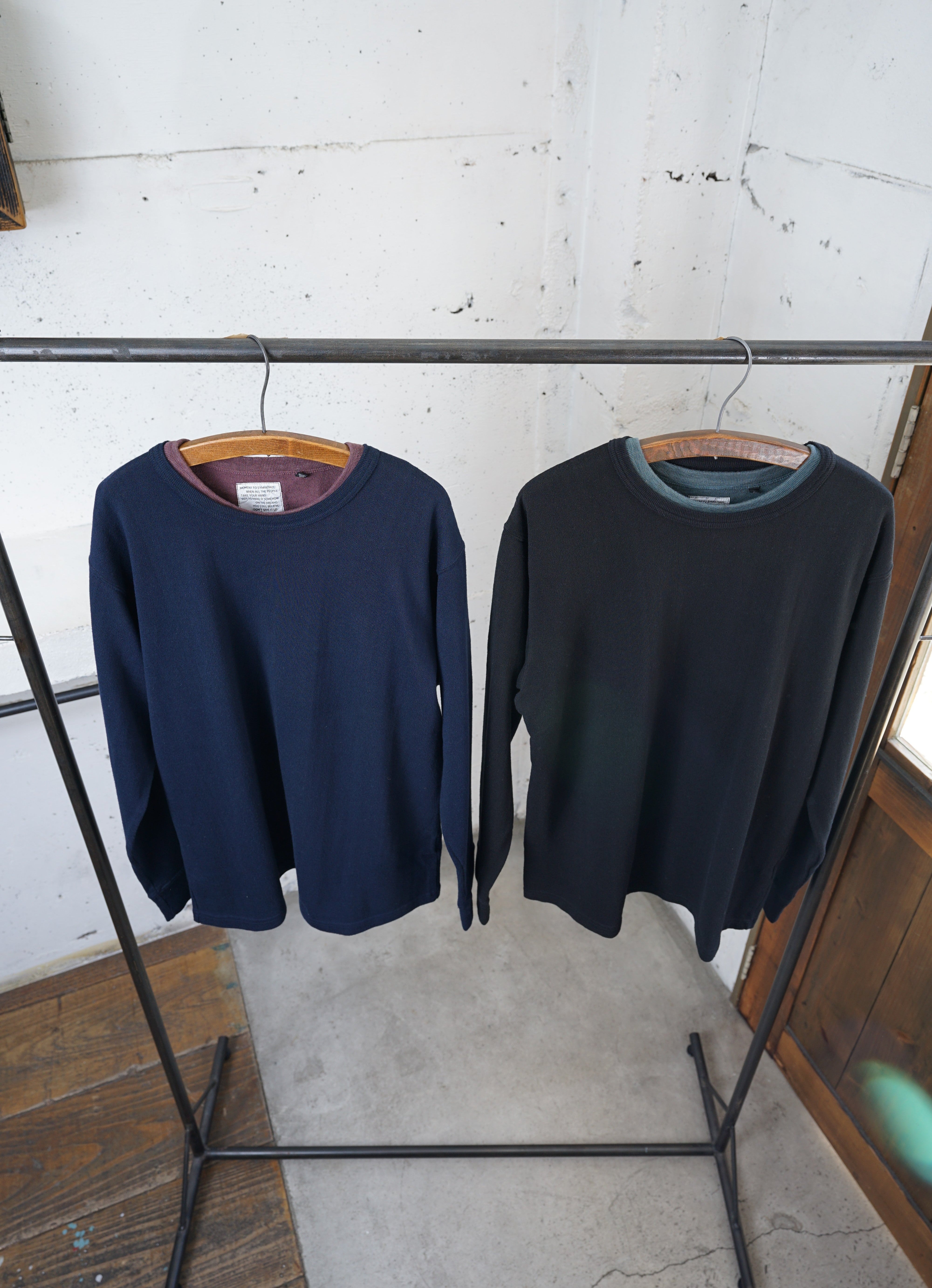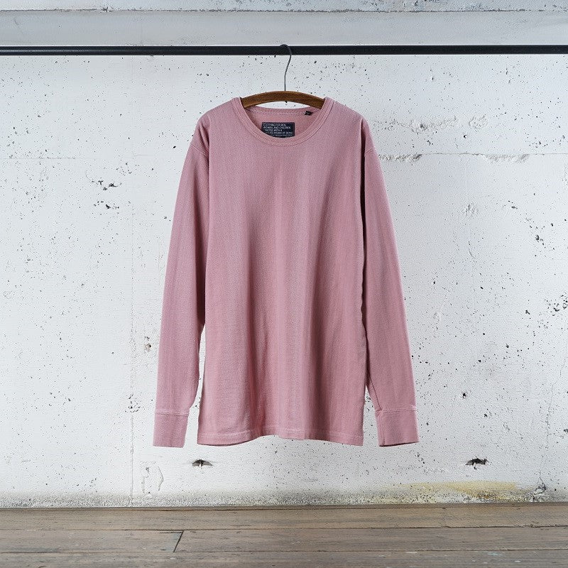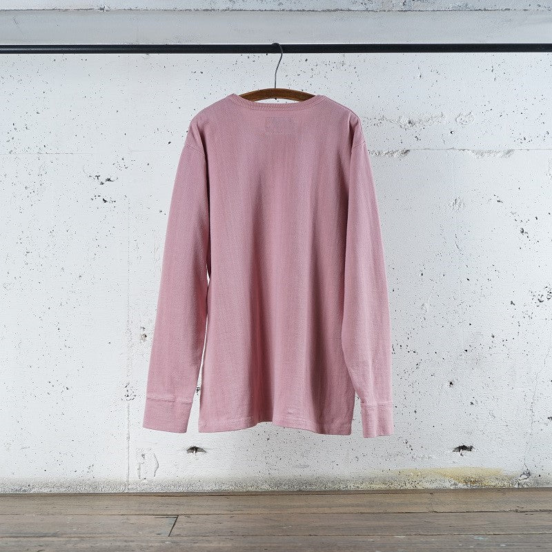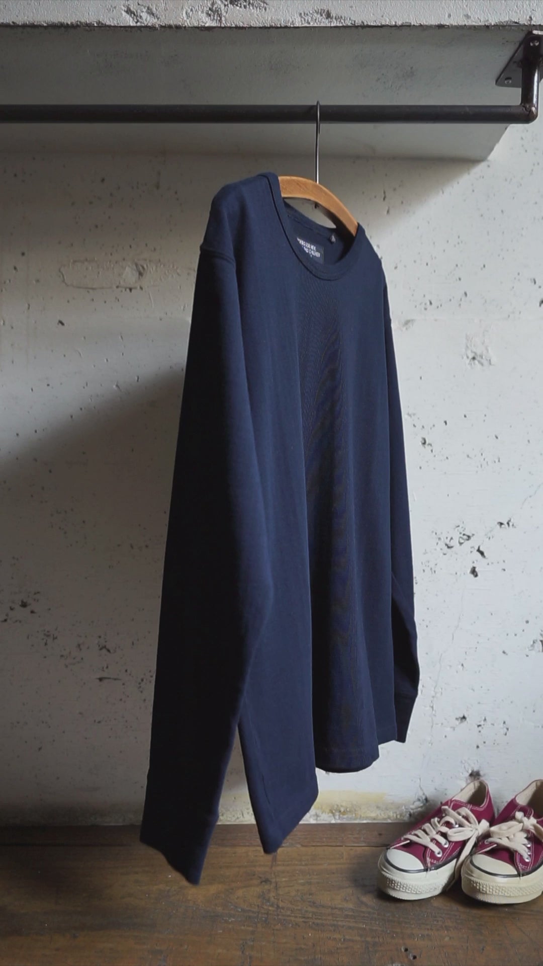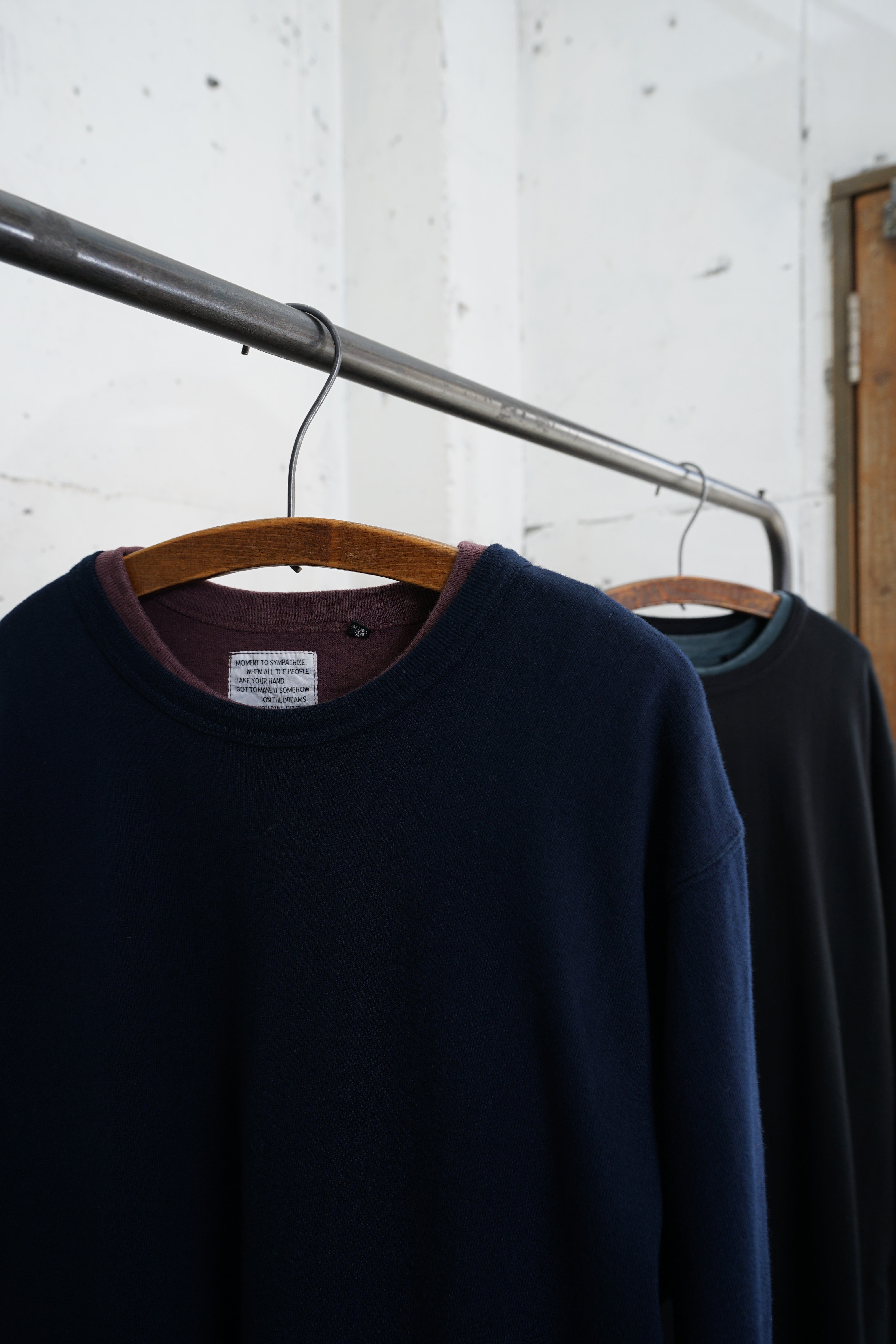 旧式吊り編み機で編み上げた、コットン×レーヨンのブレンド糸による厚めの天竺生地を使用。DF独自のレシピでゆっくりと編み上げることで、柔らかさと耐久性があり、着るほどに肌に馴染む極上の着心地に。