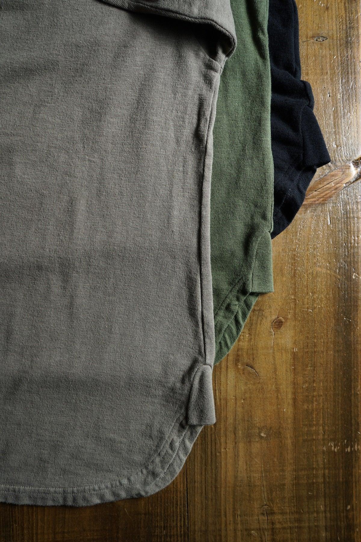 DFオリジナル天竺生地を使用。希少な旧式のトンプキン編み機を使い、別注の糸選びから番手の設定、編みの調整まで何度も試行錯誤を重ねました。