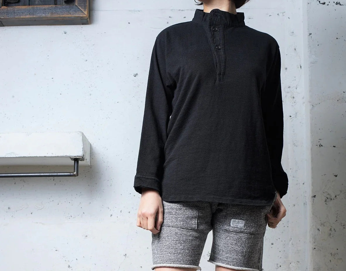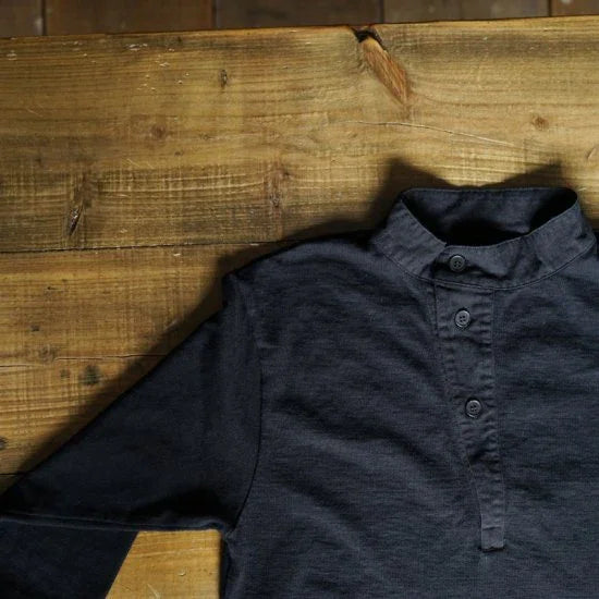 立ち襟と前立ては綿麻シーチングで切り替えており、色の染まり具合の違いがアクセントになっています。