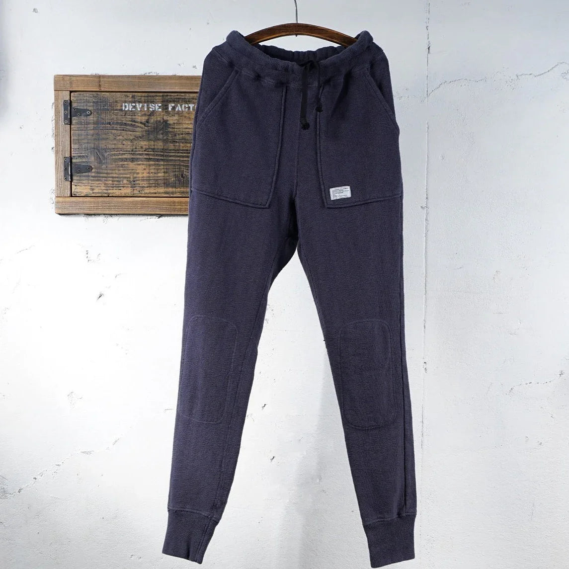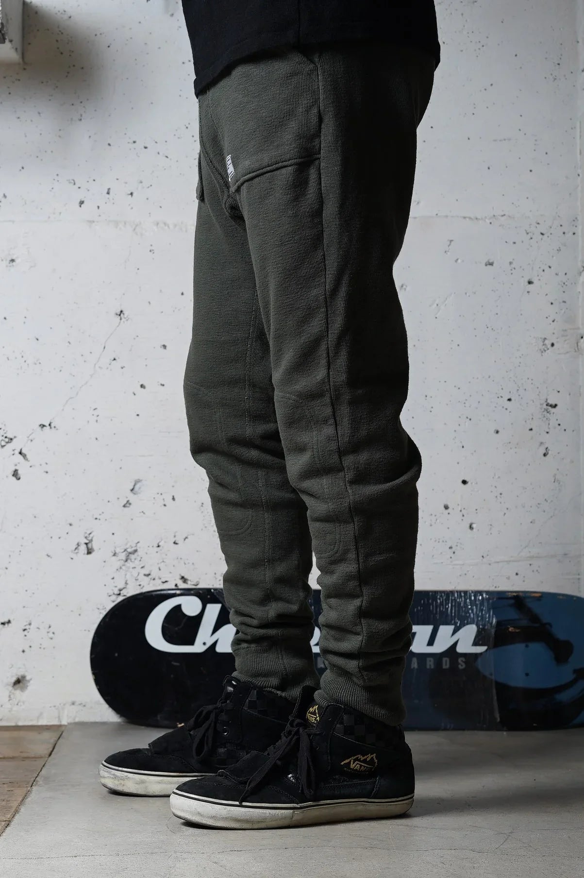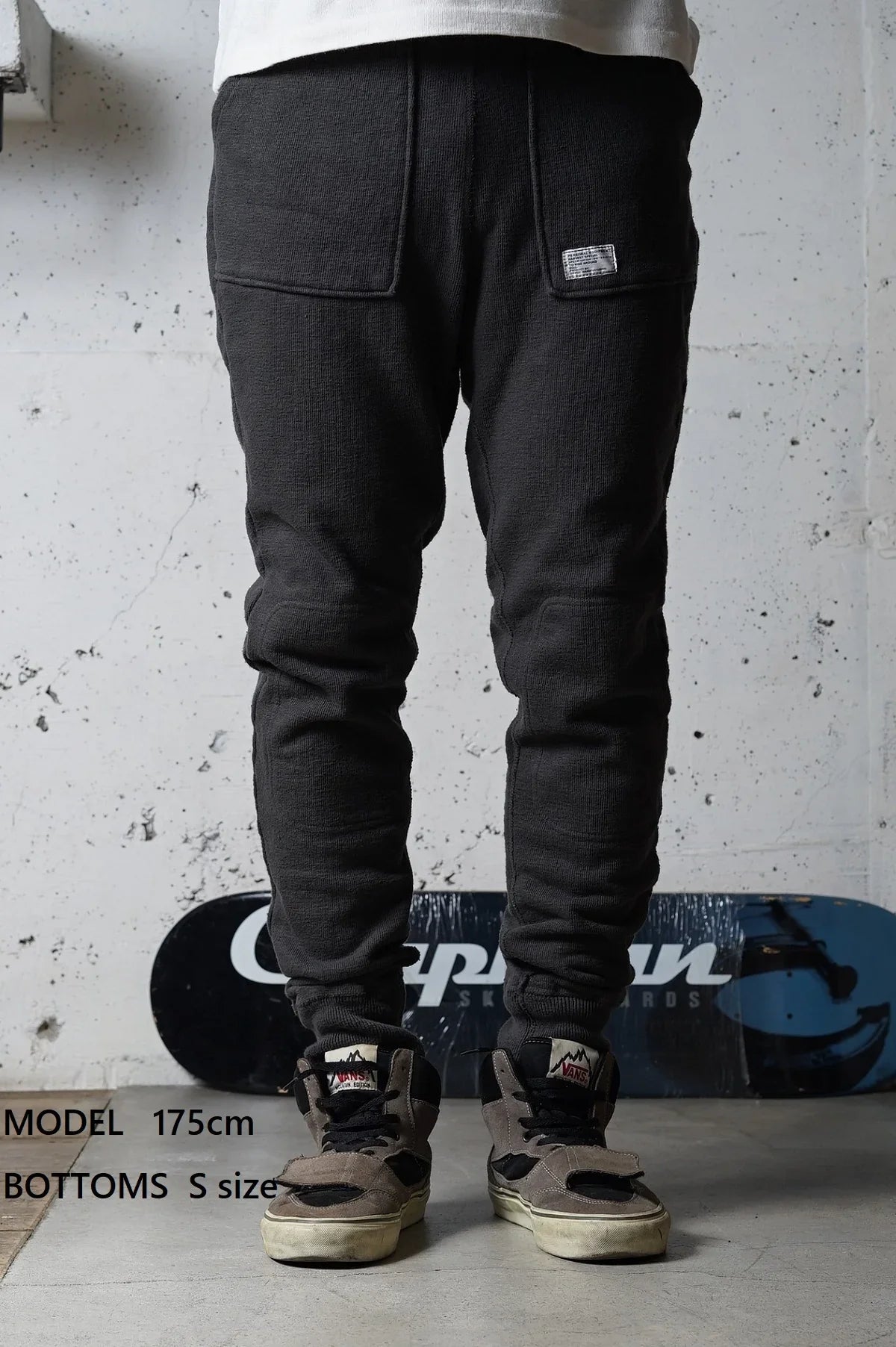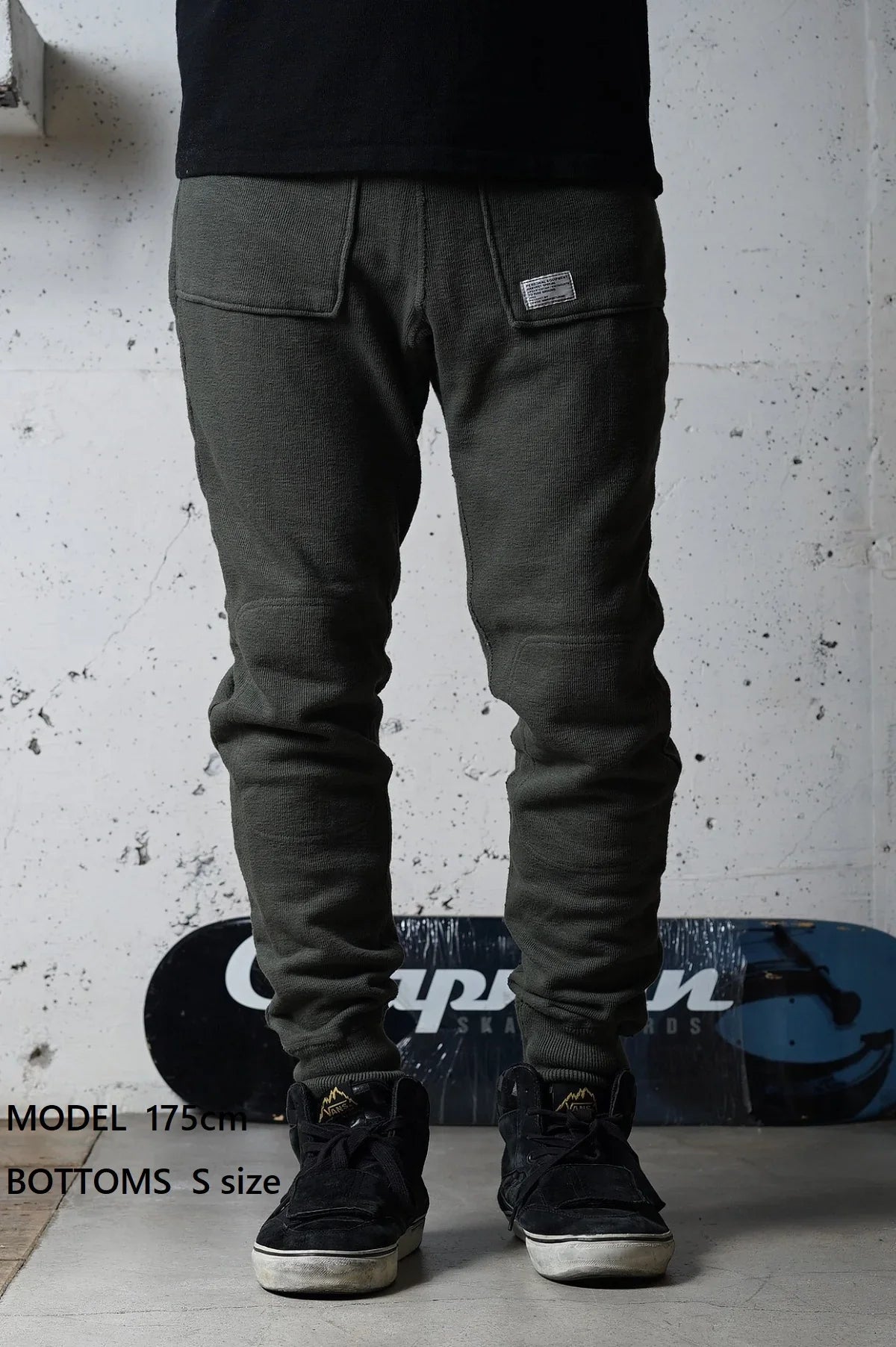 両ひざの裏部に天竺生地を重ね、着用を重ねても膝が出にくい仕様に。長く愛用できる耐久性を備えています。