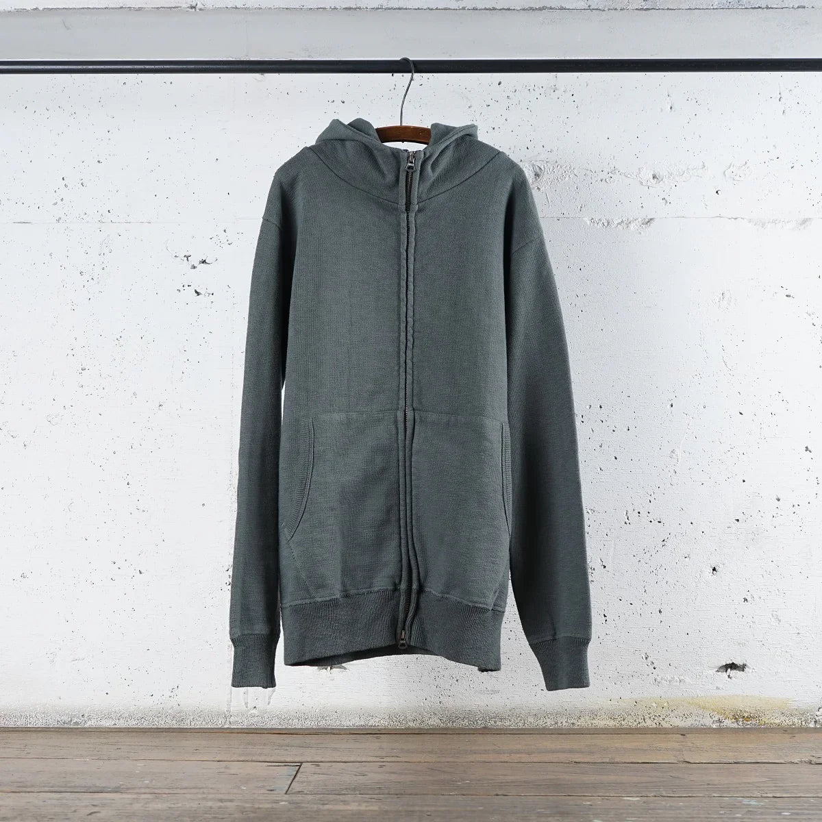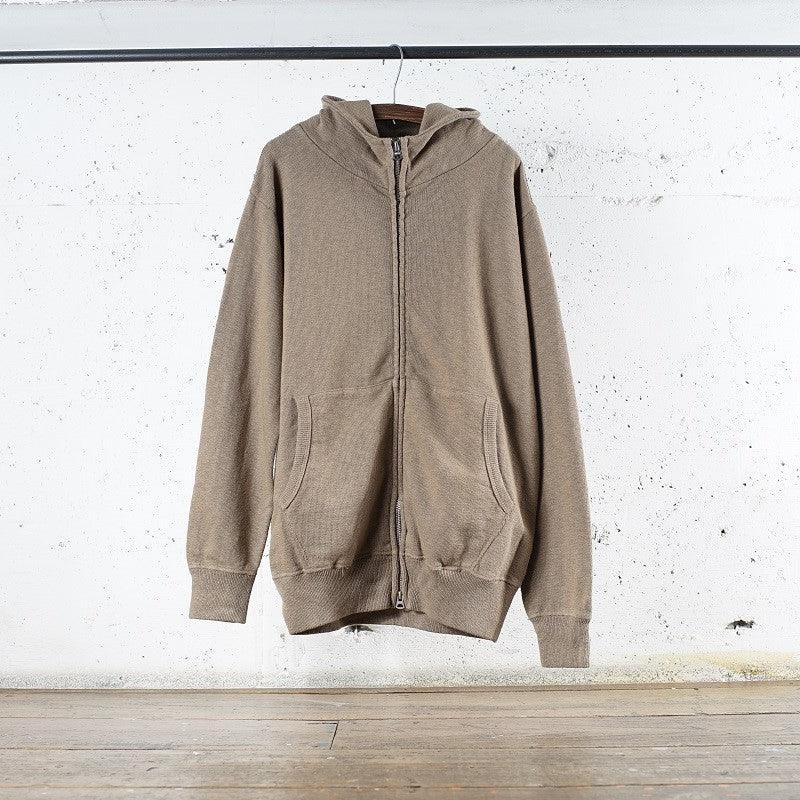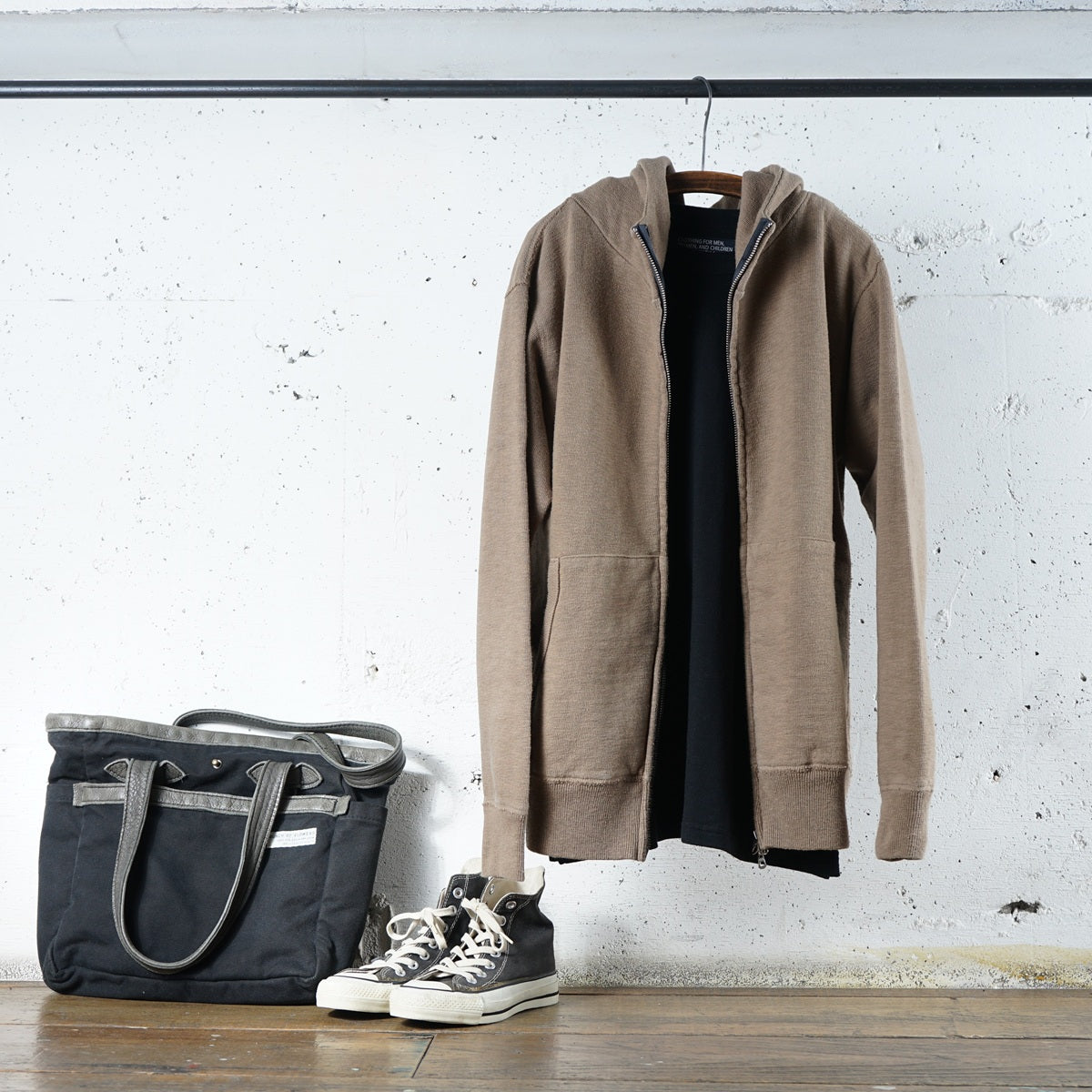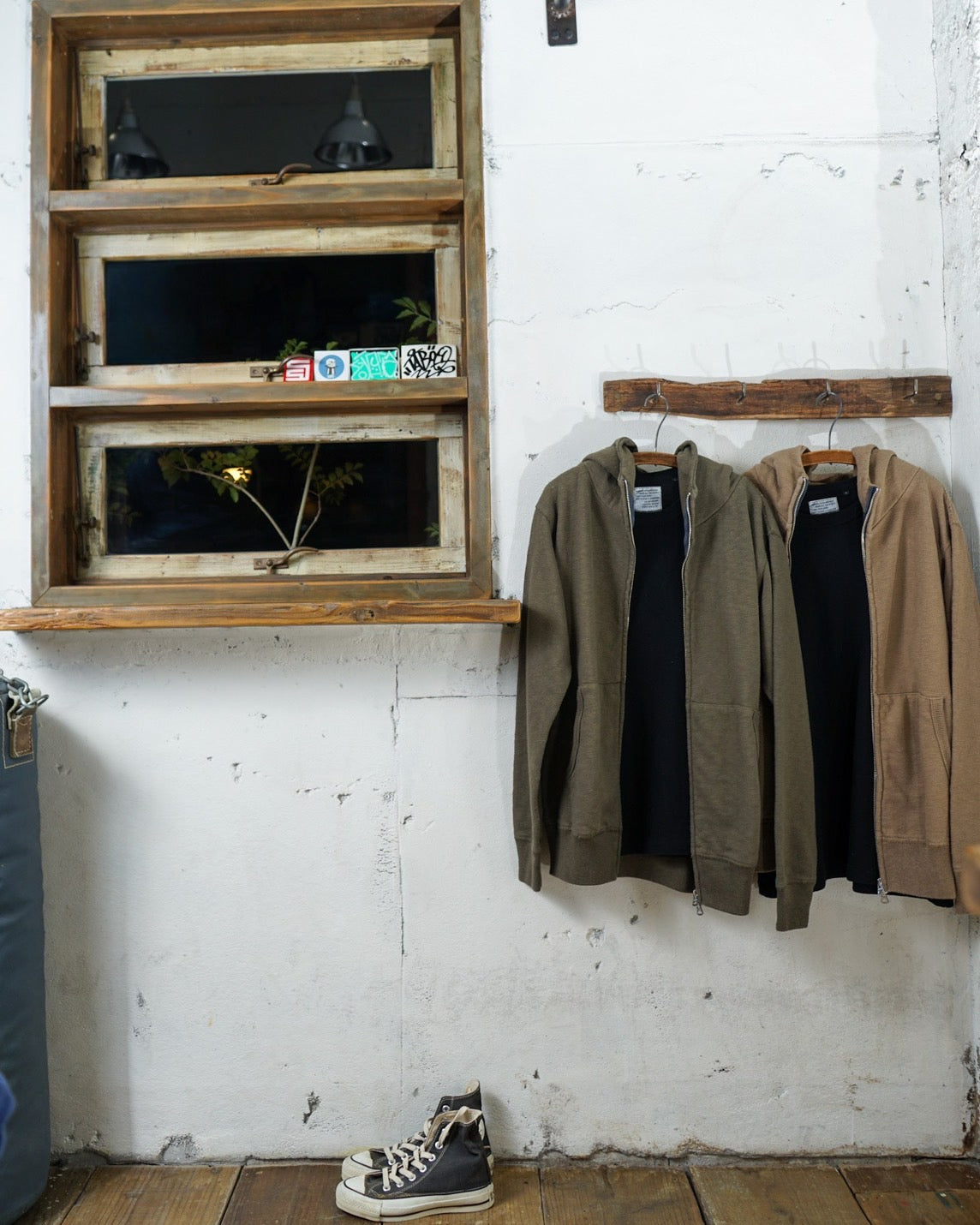 完全オリジナルの裏毛生地を使用。約100年前の希少な旧式のトンプキン編み機を使い、別注の糸選びから番手の設定、編みの調整まで何度も試行錯誤を重ねました。