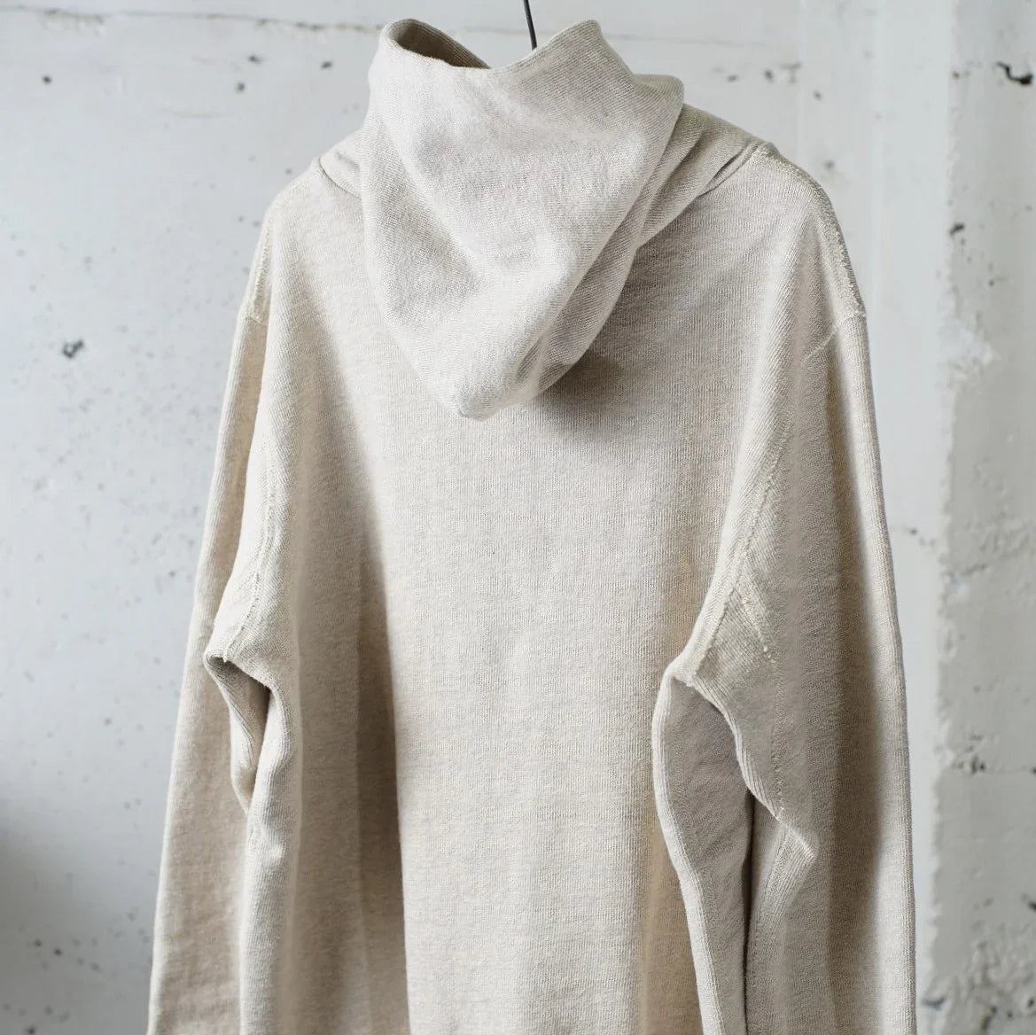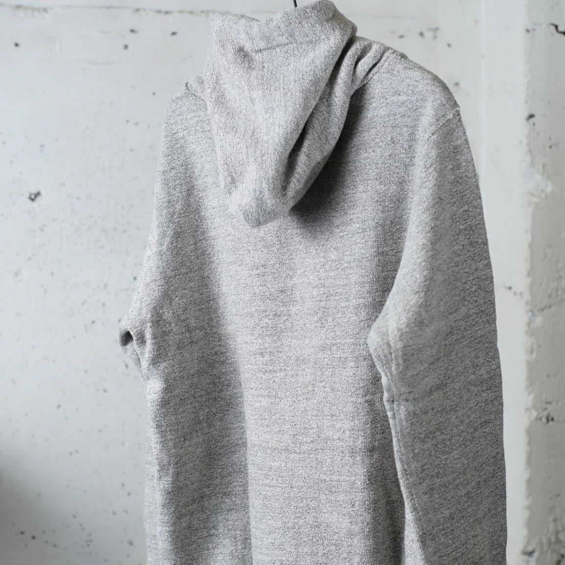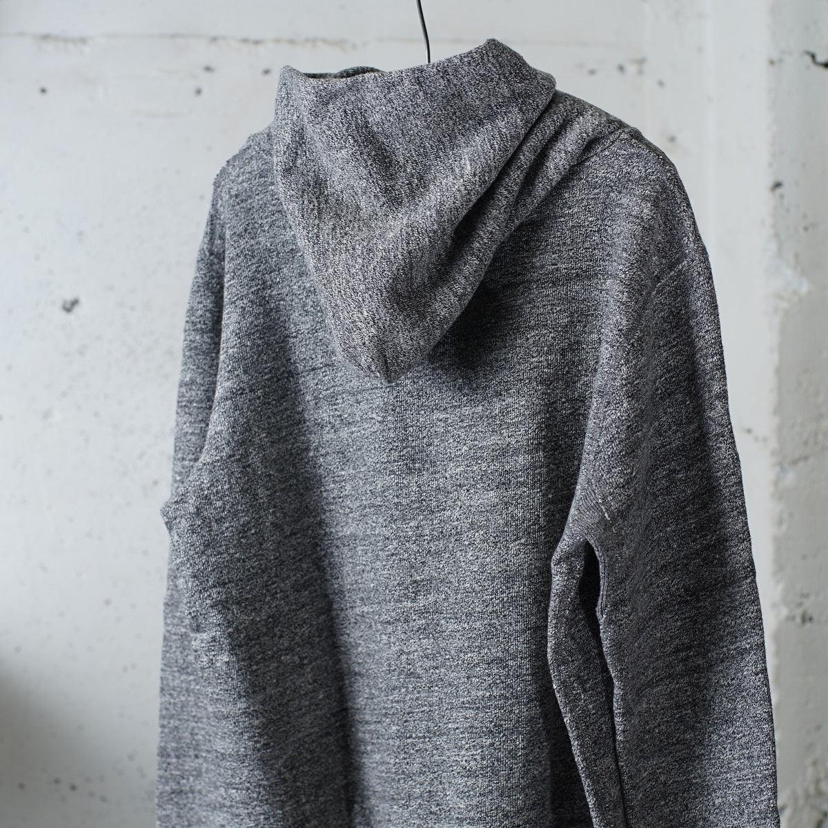 Nous utilisons un tissu polaire chiné entièrement original. À l'aide d'une machine à tricoter Tompkins, une machine à tricoter ancienne et rare, nous avons multiplié les essais et les erreurs, du choix du fil personnalisé à l'ajustement du titre et au tricotage.