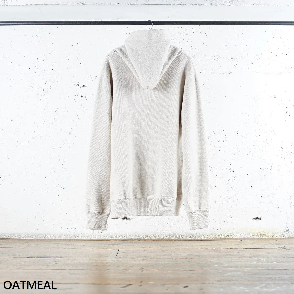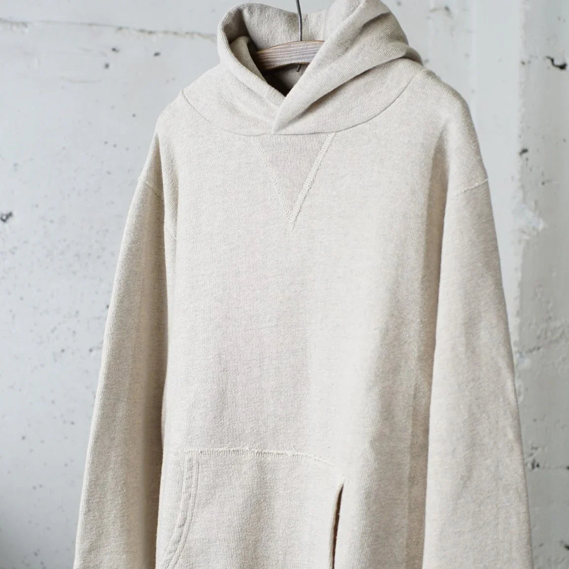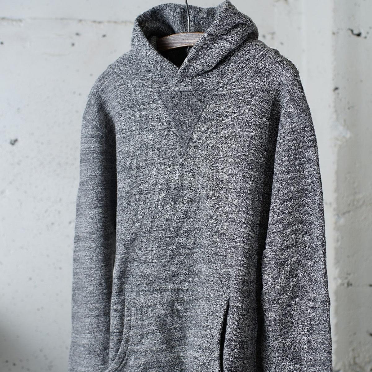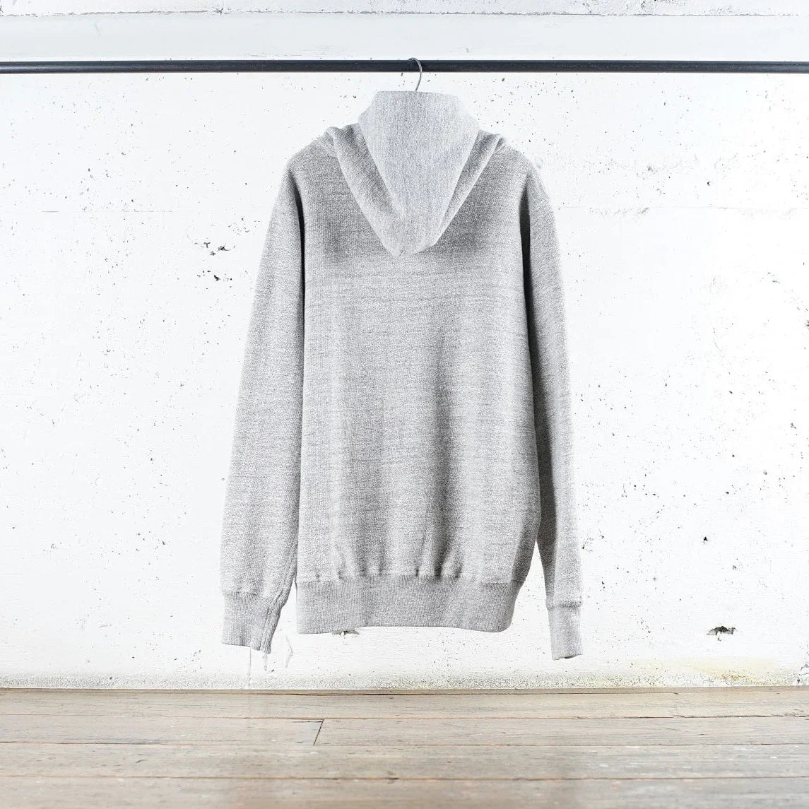 Nous utilisons un tissu polaire chiné entièrement original. À l'aide d'une machine à tricoter Tompkins, une machine à tricoter ancienne et rare, nous avons multiplié les essais et les erreurs, du choix du fil personnalisé à l'ajustement du titre et au tricotage.
