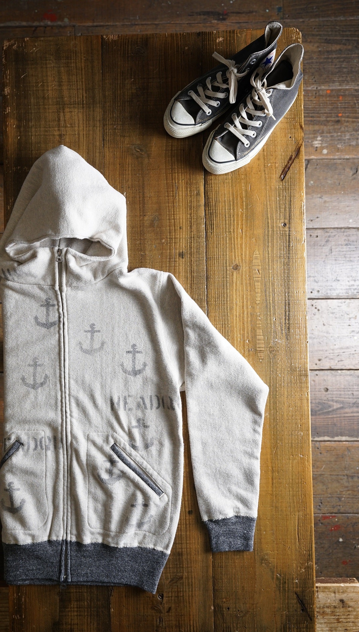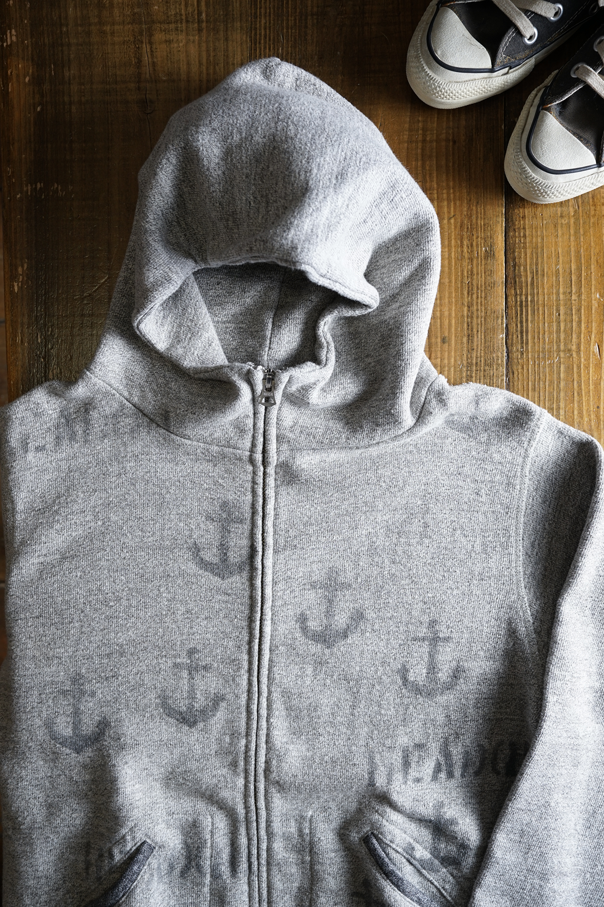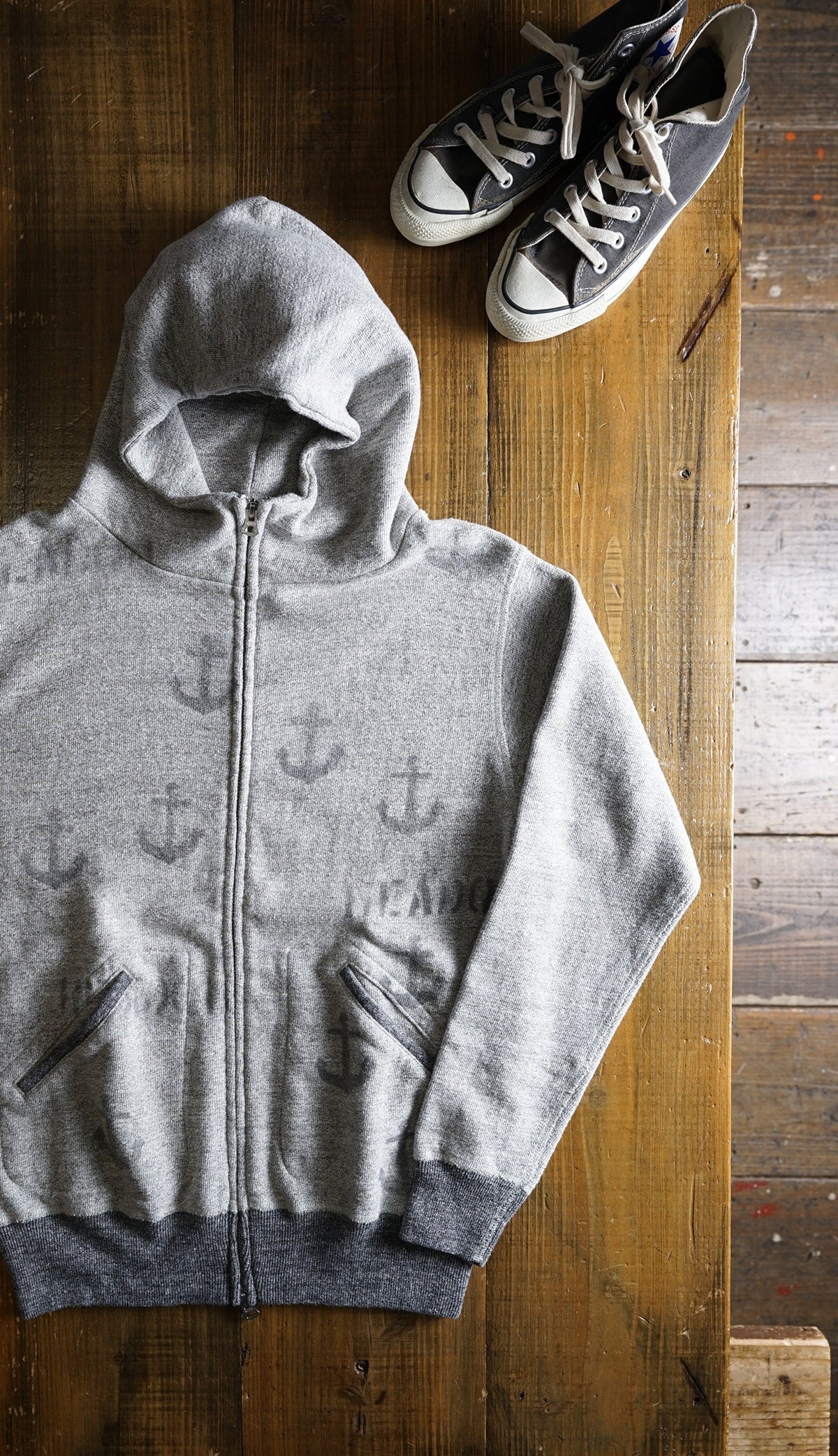 Ce sweat à capuche zippé classique à col montant, apprécié depuis de nombreuses années depuis sa sortie en 2007, est désormais disponible dans une version « impression au pochoir », avec un motif « ancre » soigneusement imprimé à la main par des artisans sur le devant un par un.