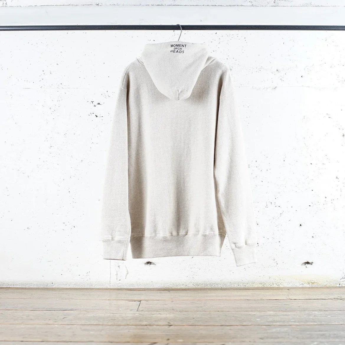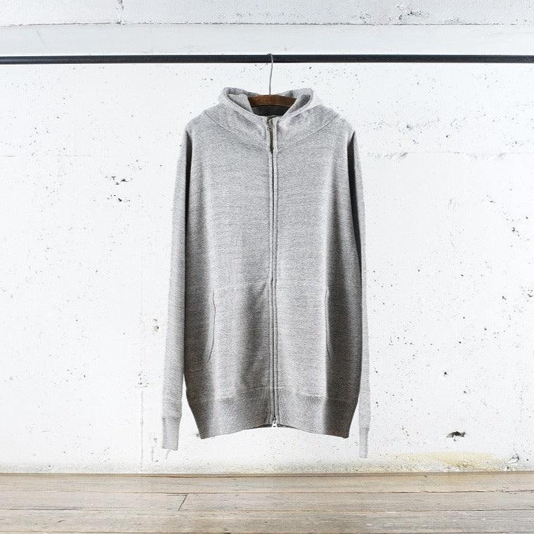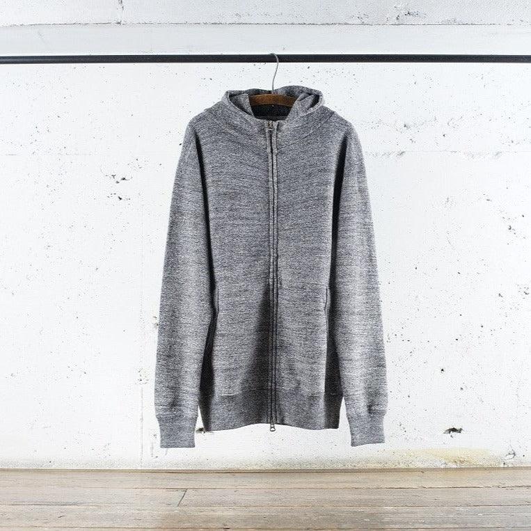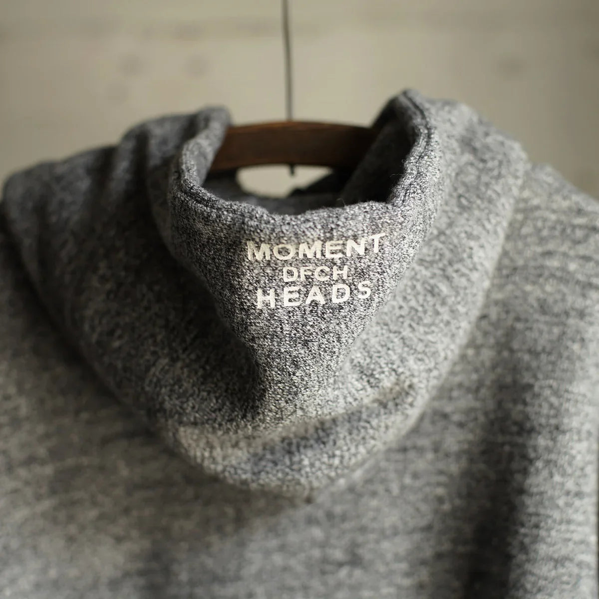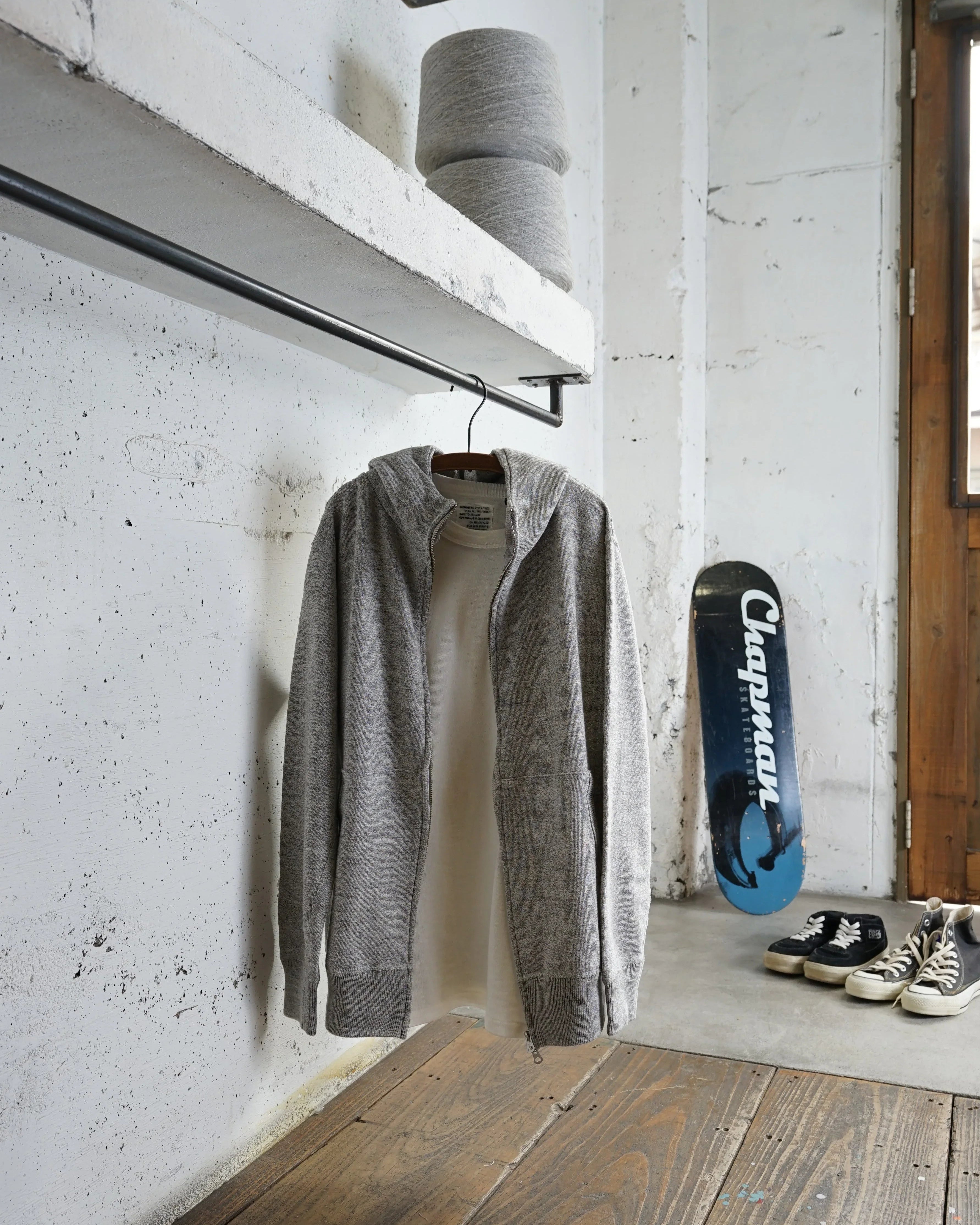 Nous utilisons un tissu polaire chiné entièrement original. À l'aide d'une machine à tricoter Tompkins, une machine à tricoter ancienne et rare, nous avons multiplié les essais et les erreurs, du choix du fil personnalisé à l'ajustement du titre et au tricotage.