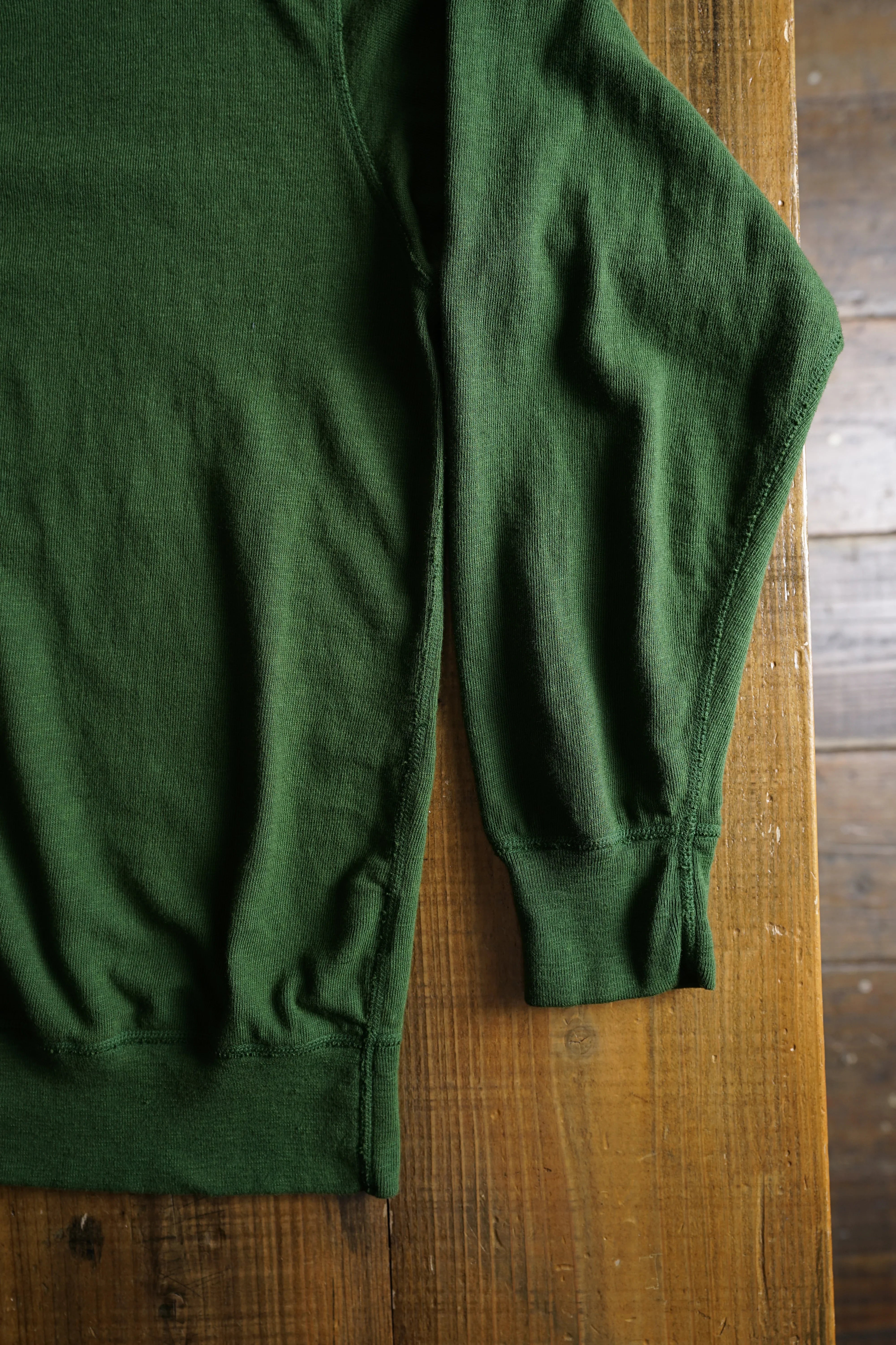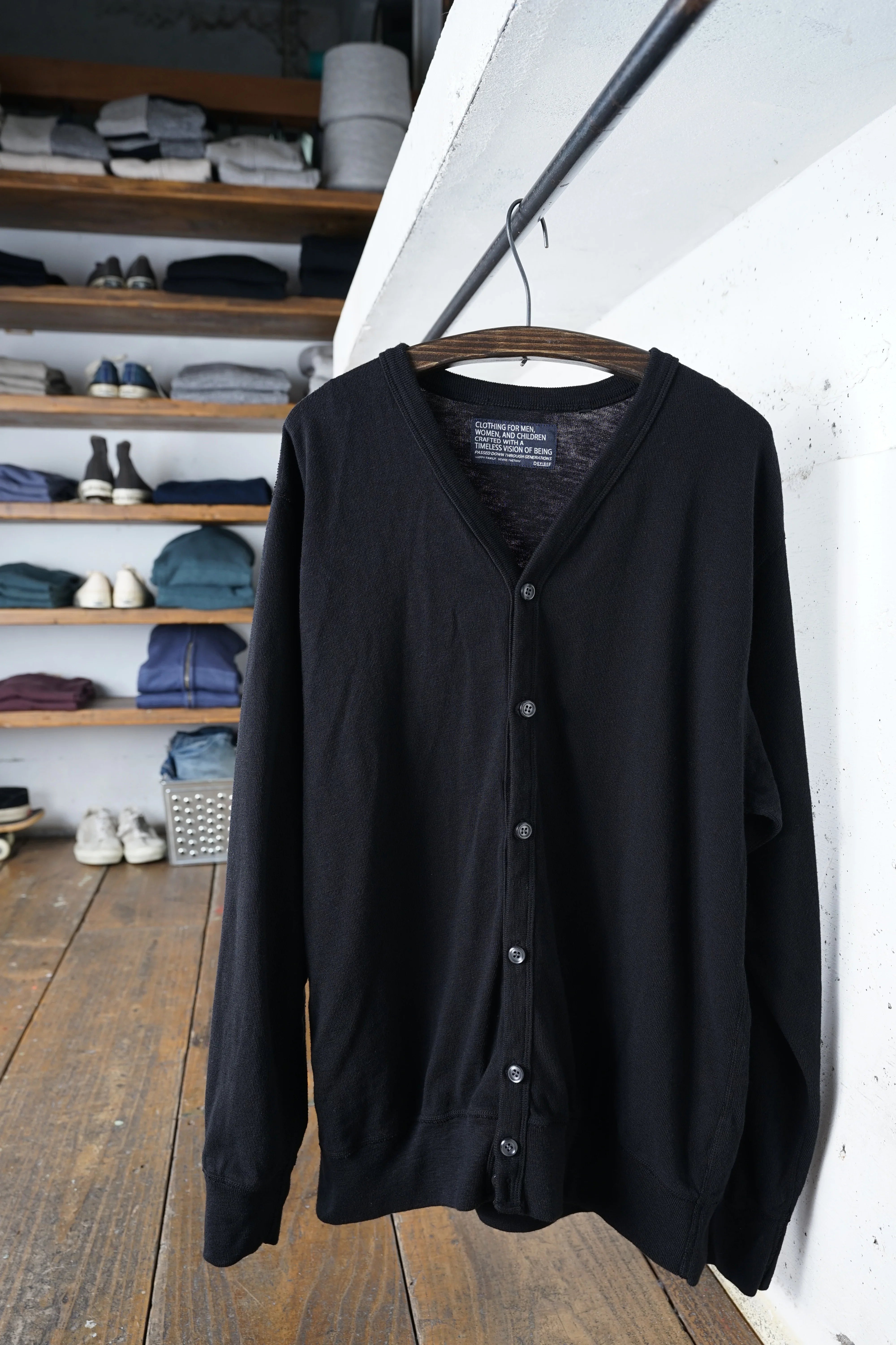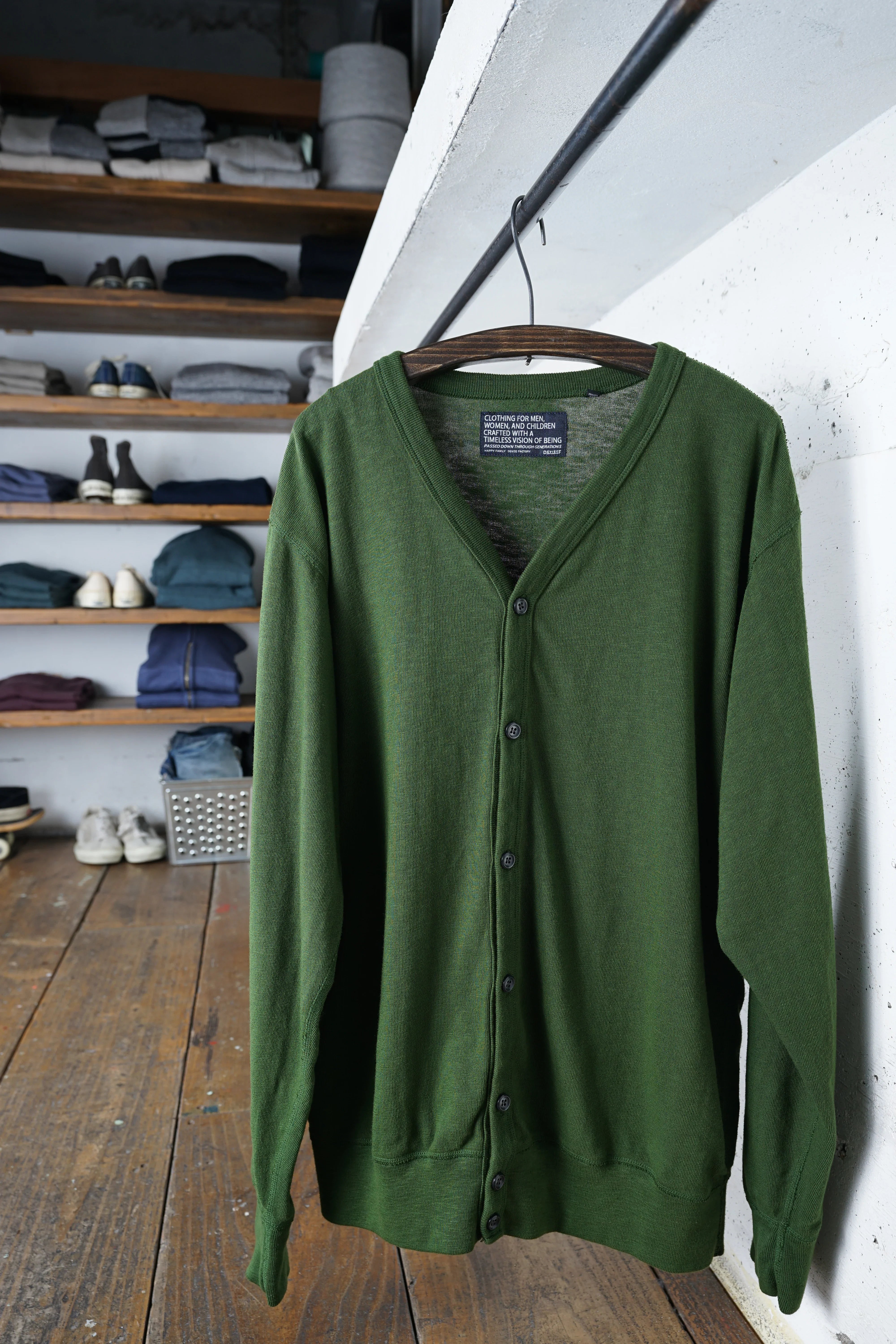 DFオリジナル天竺生地を使用。希少な旧式のトンプキン編み機を使い、完全別注の糸選びから番手の設定、編みの調整まで何度も試行錯誤を重ねました。