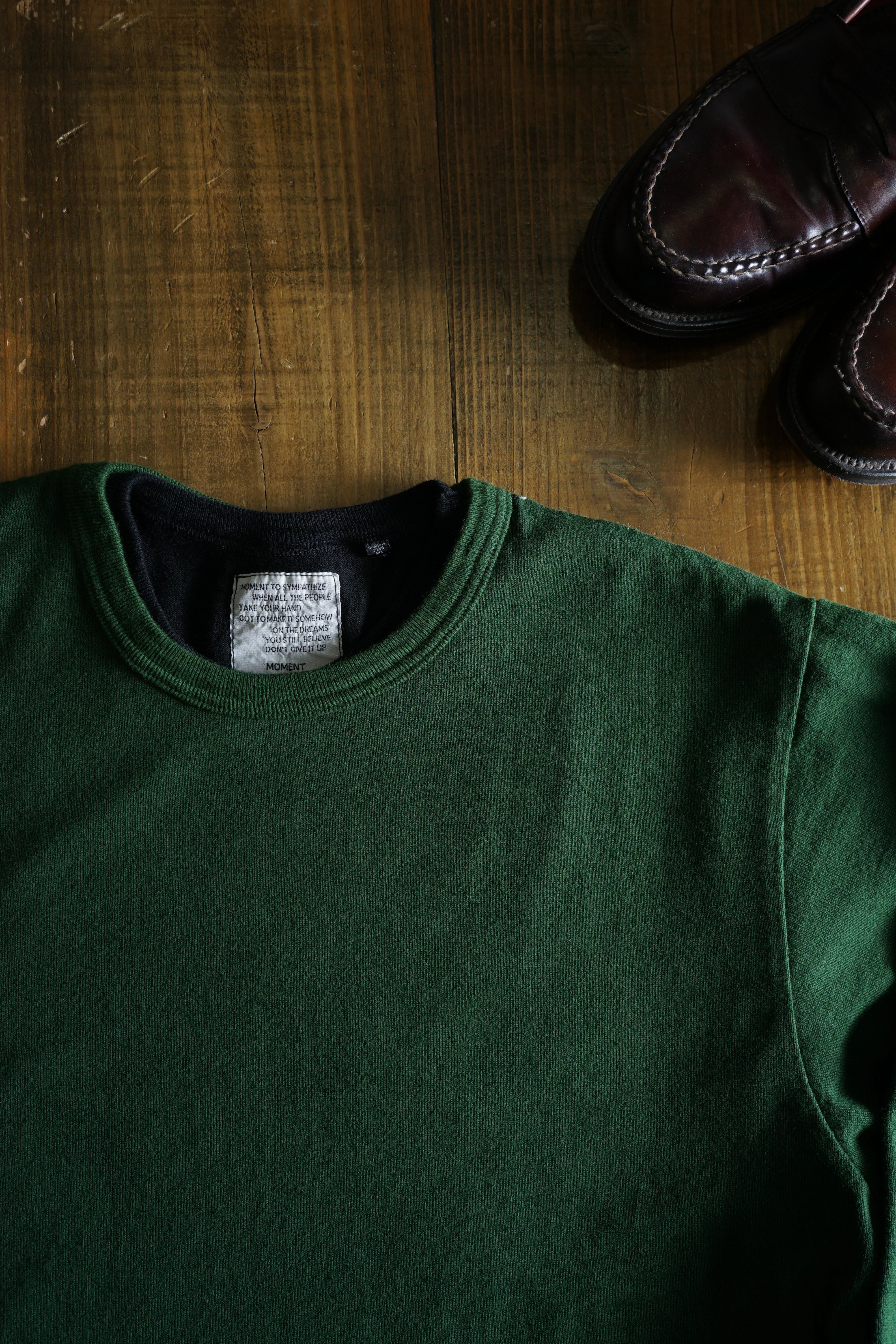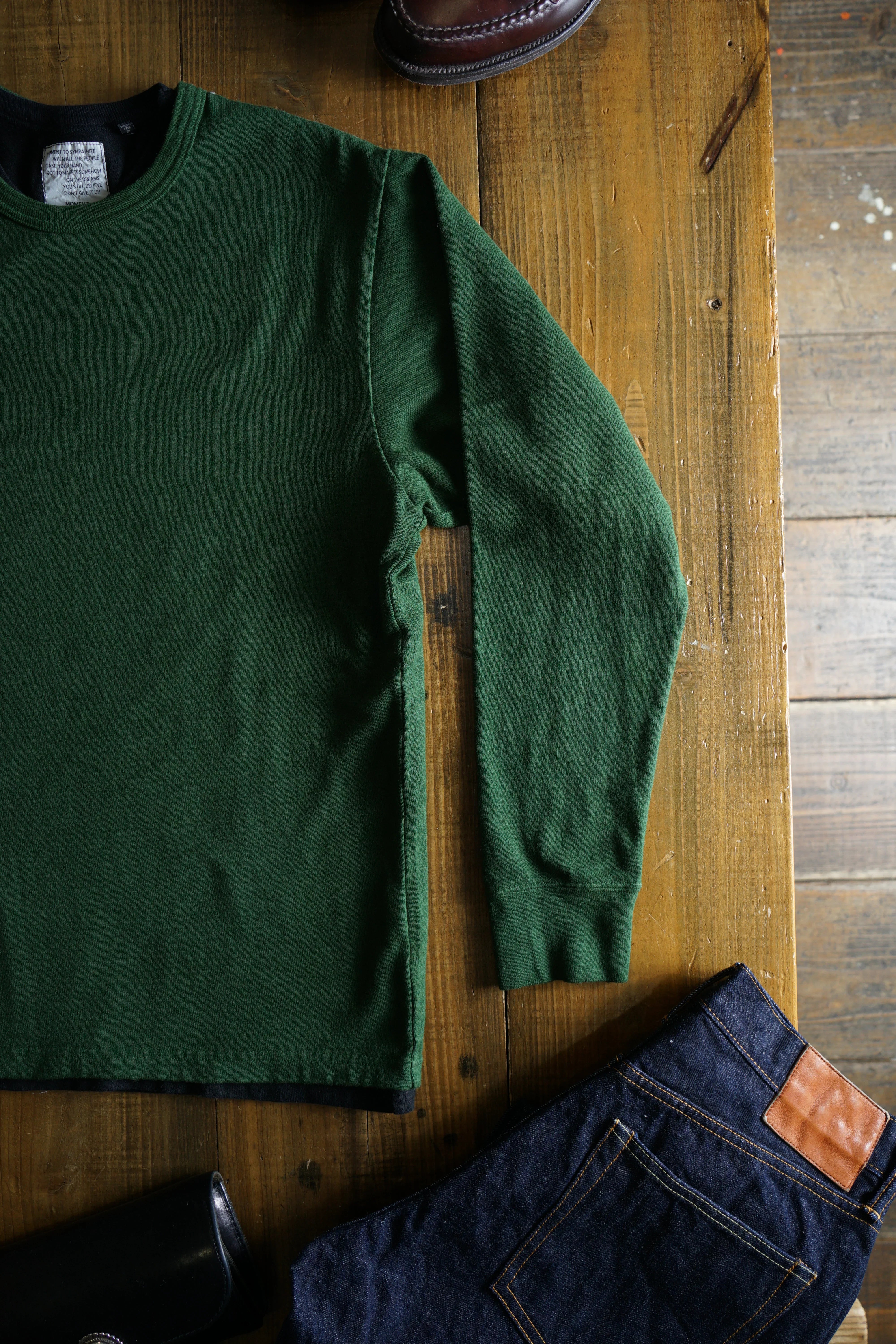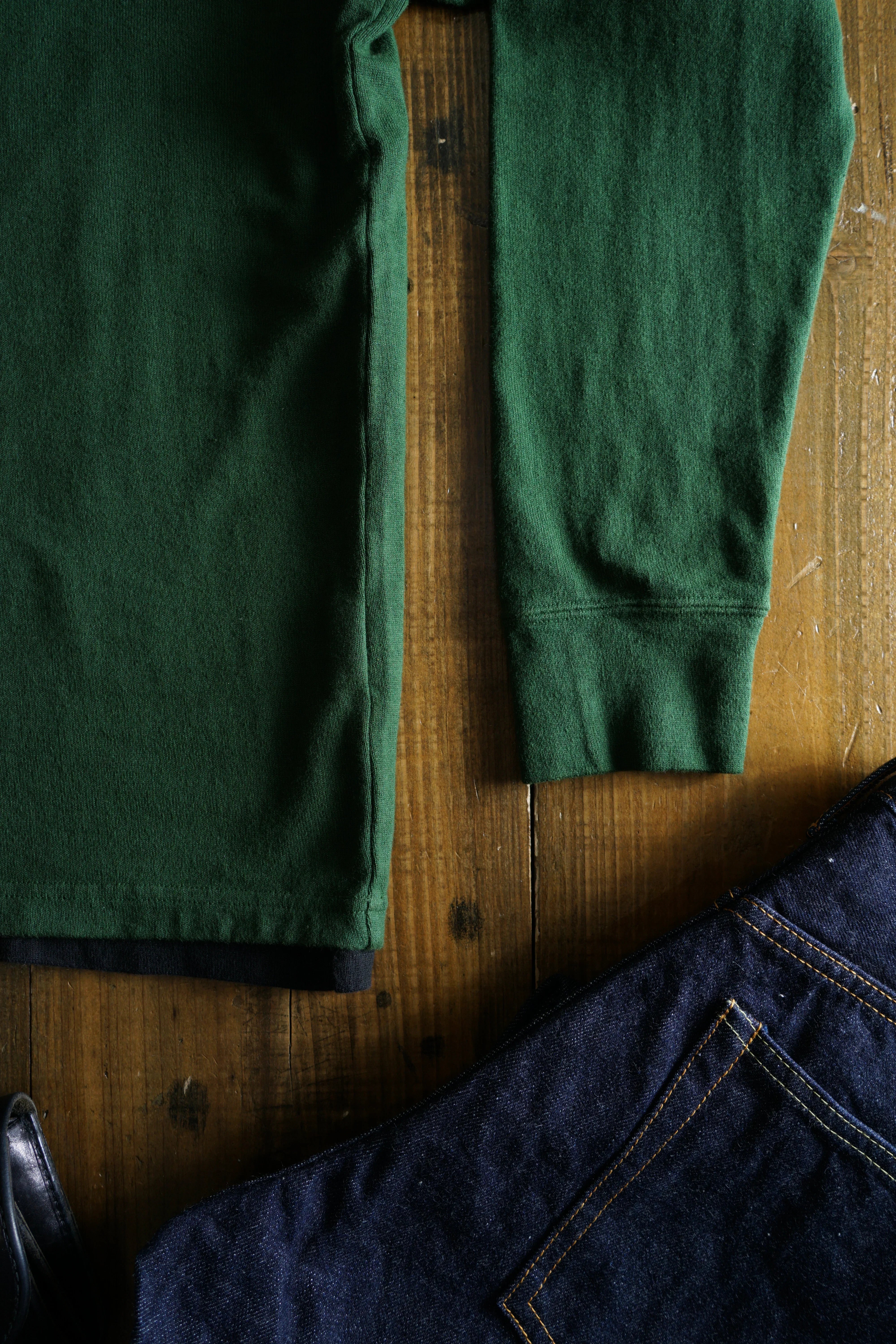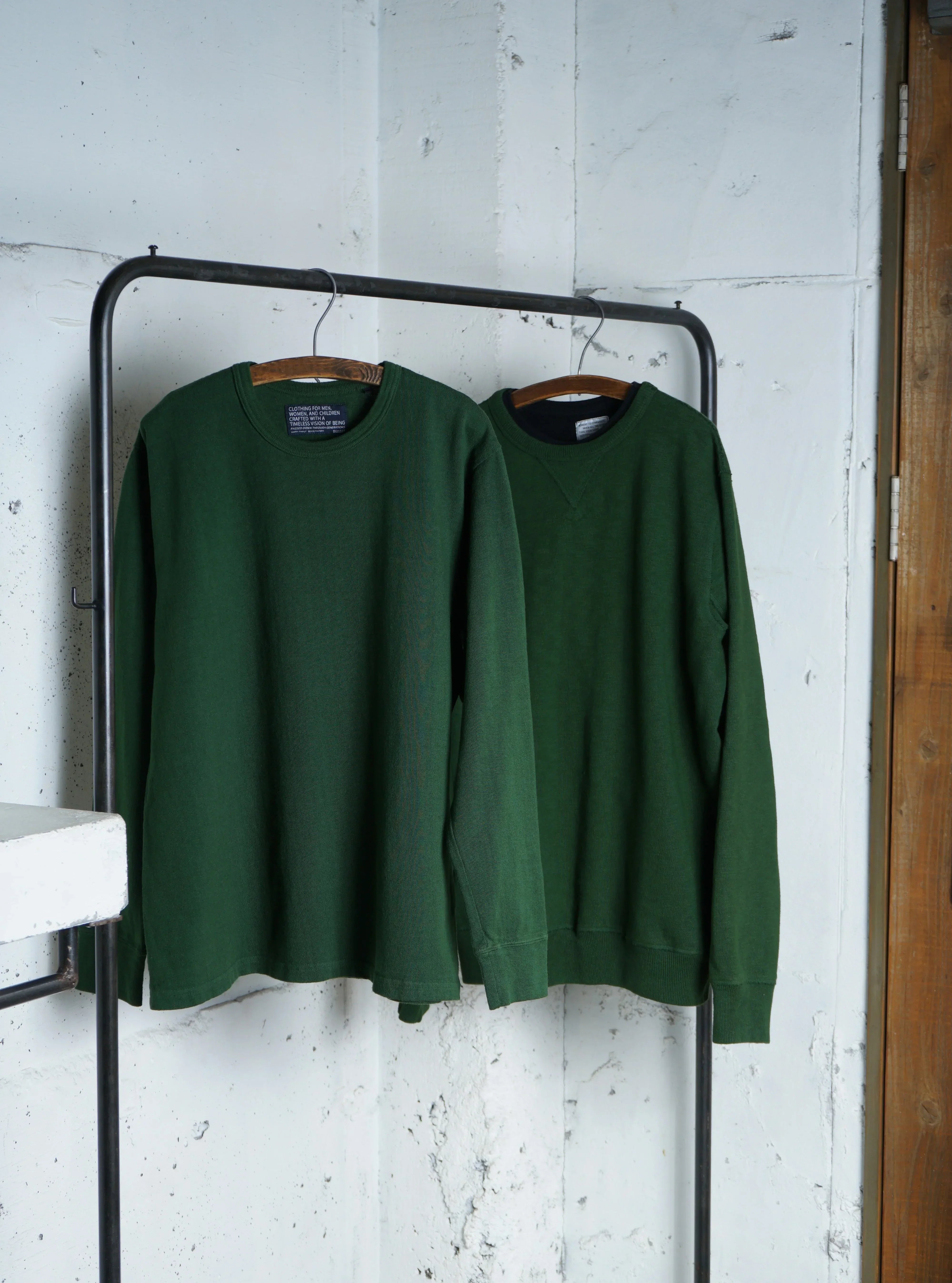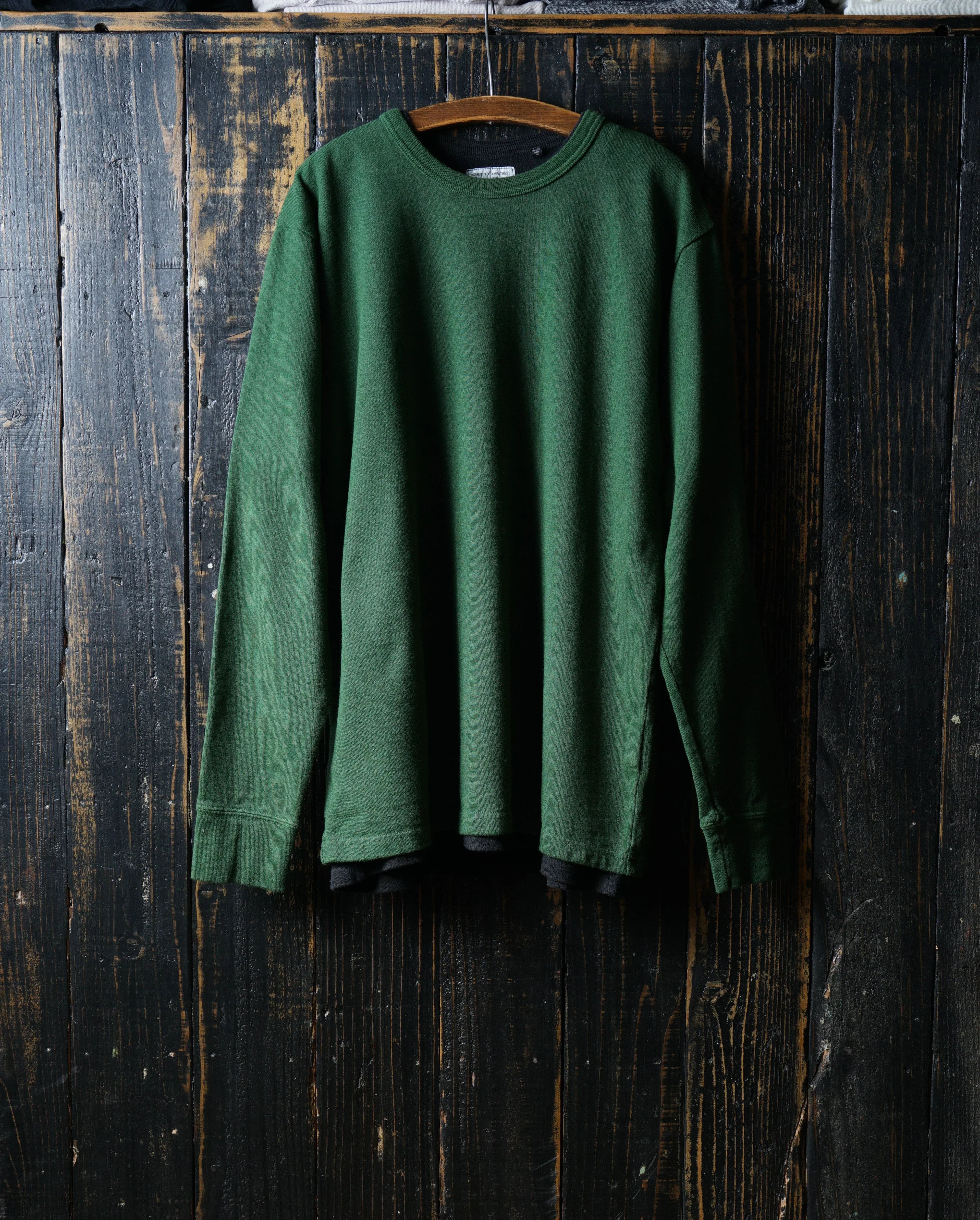 そのため、「縮みきった状態」が新品であり、洗濯による急激なサイズ変化はほとんどありません。ただし、着用を続けることで生地が緩み、洗濯や乾燥機の使用(※一部の杢天竺シリーズを除く)でわずかに縮みます。この緩みと縮みを繰り返すことで、生地が徐々にその人の身体に馴染んでいきます。