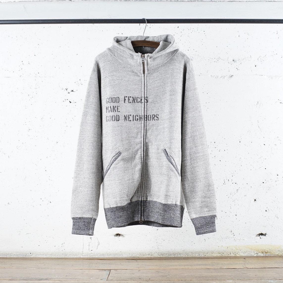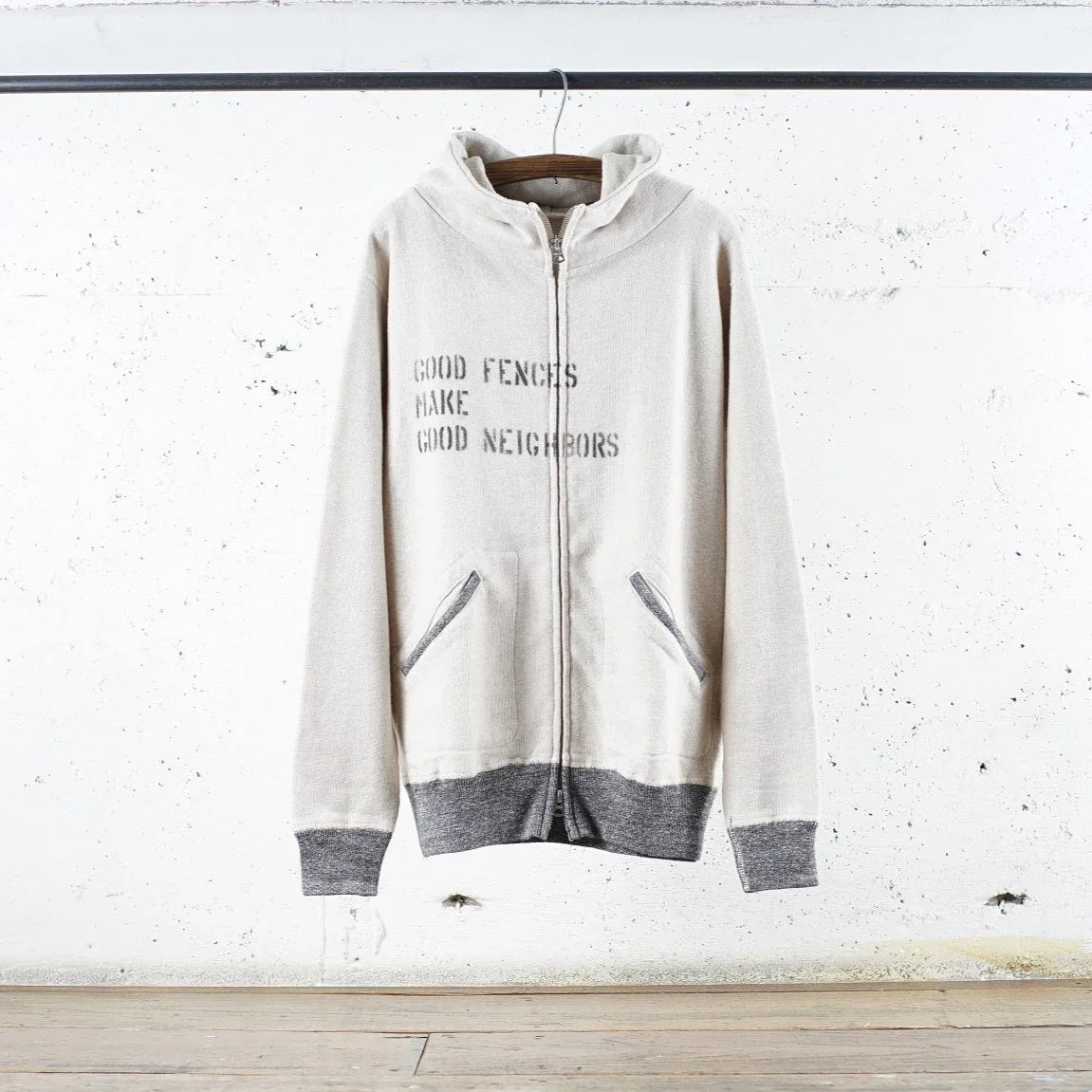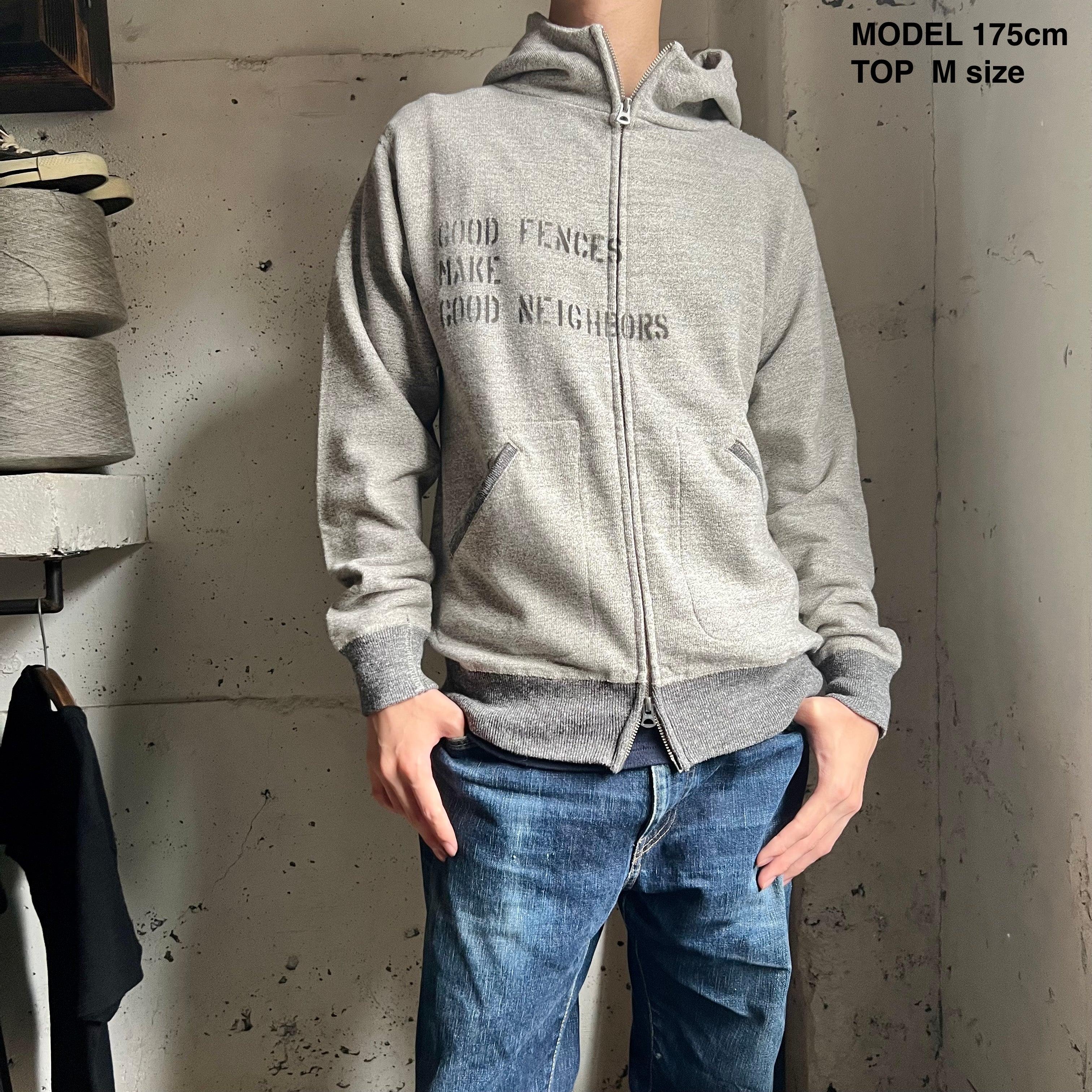 2007年に誕生してから長年愛され続けている定番のハイネック ジップパーカーに、職人さんが前身、後身に1枚ずつ丁寧に手刷りした、「ステンシルのスプレープリント」バージョンです。